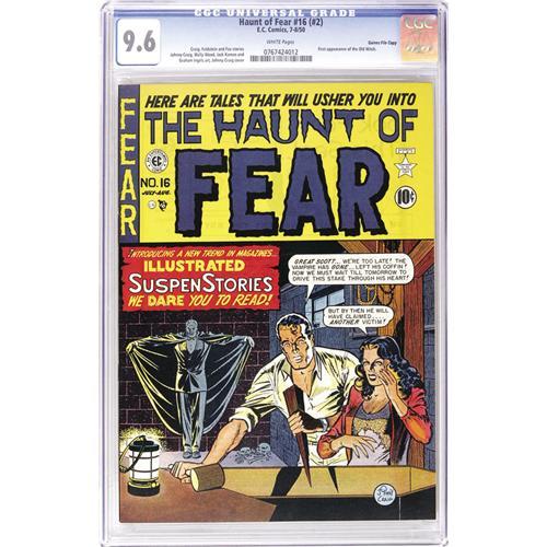 <B>Haunt of Fear #16 (#2) Gaines File pedigree (EC, 1950) CGC NM+ 9.6 White pages.</B></I> The Old Witch made her first appearance in this issue. Surprisingly enough, it was Jack Kamen who drew this first story! The tale of ancient Egypt includes a love triangle of sorts, always a Kamen specialty. Also contributing art to the issue were Johnny Craig (who also drew the cover), Graham Ingels, and the team of Wally Wood and Harry Harrison. Note that while CGC has certified this book as a Gaines File Copy, no certificate accompanies this lot. Overstreet 2006 NM- 9.2 value = $1,825. CGC census 5/06: 2 in 9.6, 4 higher. <BR><BR><B>Important notice:</B> Heritage usually auctions material at the rate of 200-250 lots per hour. On some occasions eBay Live bid software or the Internet may not be able to keep up with the pace of the auction. We recommend placing a realistic absentee bid now as insurance to avoid disappointment. Occasionally the auctioneer may eliminate or reject an eBay Live bid, and the auctioneer may also reopen a lot after the close of the eBay live bidding (usually because we missed an audience bid), and may reject your bid even if it shows you as the winning bidder. By bidding via eBay Live, you agree that Heritage may award the lot to another bidder at its sole discretion under the circumstances described above or any other reasonable circumstances. Since eBay bids are not shown to us until we open the lot on the floor, we treat those bids just like floor bids. In most cases the floor responds before the eBay bid is presented to us, due to Internet lag time, so for consistency we have made it a policy that floor bids are always considered first over tie eBay live bids. Also please note that all Heritage lots purchased through eBay Live carry a 22.5% Buyer's Premium. Please make sure you read the Terms and Conditions before you bid. This lot is being auctioned in conjunction with a live floor auction by Heritage Auction Galleries. All final auction and invoice information will be supplied by Heritage Auction Galleries, and all other information should be considered preliminary. Lot:41001 <BR><BR><B>Winning Notification and Billing:</B> After the FINAL session in this auction is complete, Heritage will send e-mail and snail mail invoices. This process normally takes several days. All final auction and invoice information will be supplied by Heritage Auction Galleries, and all other information should be considered preliminary. <BR><BR>This auction will be conducted on a live auction floor and over the Internet through eBay Live. If you choose to place an absentee bid, please take a moment to <font color='#0000ff'><u><a href='http://pages.ebay.com/liveauctions/help/before/laabsentee.html'>learn how eBay Live absentee bidding works</a></u></font><font color='#000000'>