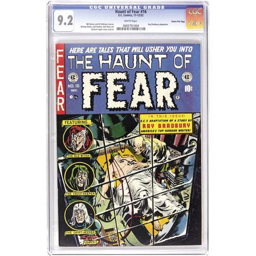 <B>Haunt of Fear #16 Gaines File pedigree 8/11 (EC, 1952) CGC NM- 9.2 White pages.</B></I> A fantastic Jack Davis-drawn adaptation of a Ray Bradbury story highlights this issue. What would you do if you found that a deceased relative had built an elaborate coffin. Would you try lying inside of it? That's what the fellow in "The Coffin" decides to do! Graham Ingels, Jack Kamen, and George Evans also contributed to the issue; the cover's by Ingels. Overstreet 2006 NM- 9.2 value = $500. CGC census 6/06: 1 in 9.2, 6 higher. <BR><BR><B>Important notice:</B> Heritage usually auctions material at the rate of 200-250 lots per hour. On some occasions eBay Live bid software or the Internet may not be able to keep up with the pace of the auction. We recommend placing a realistic absentee bid now as insurance to avoid disappointment. Occasionally the auctioneer may eliminate or reject an eBay Live bid, and the auctioneer may also reopen a lot after the close of the eBay live bidding (usually because we missed an audience bid), and may reject your bid even if it shows you as the winning bidder. By bidding via eBay Live, you agree that Heritage may award the lot to another bidder at its sole discretion under the circumstances described above or any other reasonable circumstances. Since eBay bids are not shown to us until we open the lot on the floor, we treat those bids just like floor bids. In most cases the floor responds before the eBay bid is presented to us, due to Internet lag time, so for consistency we have made it a policy that floor bids are always considered first over tie eBay live bids. Also please note that all Heritage lots purchased through eBay Live carry a 22.5% Buyer's Premium. Please make sure you read the Terms and Conditions before you bid. This lot is being auctioned in conjunction with a live floor auction by Heritage Auction Galleries. All final auction and invoice information will be supplied by Heritage Auction Galleries, and all other information should be considered preliminary. Lot:41001 <BR><BR><B>Winning Notification and Billing:</B> After the FINAL session in this auction is complete, Heritage will send e-mail and snail mail invoices. This process normally takes several days. All final auction and invoice information will be supplied by Heritage Auction Galleries, and all other information should be considered preliminary. <BR><BR>This auction will be conducted on a live auction floor and over the Internet through eBay Live. If you choose to place an absentee bid, please take a moment to <font color='#0000ff'><u><a href='http://pages.ebay.com/liveauctions/help/before/laabsentee.html'>learn how eBay Live absentee bidding works</a></u></font><font color='#000000'>