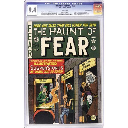<B>Haunt of Fear #17 (#3) Gaines File pedigree (EC, 1950) CGC NM 9.4 White pages.</B></I> The origins of the Crypt of Terror, the Vault of Horror, <I>and</B></I> the Haunt of Fear are revealed in this issue -- it turns out that the GhouLunatics who dwell in those three horrid habitats captured Bill Gaines and Al Feldstein and forced them to sign contracts to publish horror stories! This issue was used in <B>Seduction of The Innocent</B></I>, and oddly, it wasn't criticized for any of the crypts or the horror, but because it "shows the same predilection for non-language expletives familiar in other comics." Tut-tut, and we really mean that. The issue has a Johnny Craig cover, with interior art by Craig, Al Feldstein, Harvey Kurtzman, and Graham Ingels. Note that while CGC has certified this book as a Gaines File Copy, no certificate accompanies this lot. Overstreet 2006 NM- 9.2 value = $1,825. CGC census 5/06: 1 in 9.4, 3 higher. <BR><BR><B>Important notice:</B> Heritage usually auctions material at the rate of 200-250 lots per hour. On some occasions eBay Live bid software or the Internet may not be able to keep up with the pace of the auction. We recommend placing a realistic absentee bid now as insurance to avoid disappointment. Occasionally the auctioneer may eliminate or reject an eBay Live bid, and the auctioneer may also reopen a lot after the close of the eBay live bidding (usually because we missed an audience bid), and may reject your bid even if it shows you as the winning bidder. By bidding via eBay Live, you agree that Heritage may award the lot to another bidder at its sole discretion under the circumstances described above or any other reasonable circumstances. Since eBay bids are not shown to us until we open the lot on the floor, we treat those bids just like floor bids. In most cases the floor responds before the eBay bid is presented to us, due to Internet lag time, so for consistency we have made it a policy that floor bids are always considered first over tie eBay live bids. Also please note that all Heritage lots purchased through eBay Live carry a 22.5% Buyer's Premium. Please make sure you read the Terms and Conditions before you bid. This lot is being auctioned in conjunction with a live floor auction by Heritage Auction Galleries. All final auction and invoice information will be supplied by Heritage Auction Galleries, and all other information should be considered preliminary. Lot:41001 <BR><BR><B>Winning Notification and Billing:</B> After the FINAL session in this auction is complete, Heritage will send e-mail and snail mail invoices. This process normally takes several days. All final auction and invoice information will be supplied by Heritage Auction Galleries, and all other information should be considered preliminary. <BR><BR>This auction will be conducted on a live auction floor and over the Internet through eBay Live. If you choose to place an absentee bid, please take a moment to <font color='#0000ff'><u><a href='http://pages.ebay.com/liveauctions/help/before/laabsentee.html'>learn how eBay Live absentee bidding works</a></u></font><font color='#000000'>