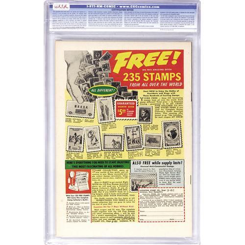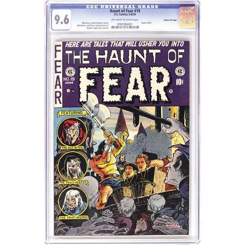 <B>Haunt of Fear #19 Gaines File pedigree 10/12 (EC, 1953) CGC NM+ 9.6 Off-white to white pages.</B></I> When a cover with a beheading scene (by Graham Ingels) isn't even the most shocking thing about a comic, you know there must be some horrific stuff inside the issue! In this case, it's the story "Foul Play," in particular a panel showing a baseball game with a dead man's head as the ball, his heart as home plate, and... you get the idea. It got mentioned by the Senate investigation on juvenile delinquency, it was shown in <B>Seduction of the Innocent</B></I> by Fredric Wertham, and it was also singled out in an article Wertham wrote two decades later, with the author noting, "The writer of this story became editor of the immensely successful magazine <B>Mad</B></I>; the artist... later did many covers for <B>Time</B></I>." That would be Al Feldstein and Jack Davis respectively. George Evans and Jack Kamen also contributed art to the issue. Overstreet 2006 NM- 9.2 value = $650. CGC census 5/06: 2 in 9.6, 3 higher. <BR><BR><B>Important notice:</B> Heritage usually auctions material at the rate of 200-250 lots per hour. On some occasions eBay Live bid software or the Internet may not be able to keep up with the pace of the auction. We recommend placing a realistic absentee bid now as insurance to avoid disappointment. Occasionally the auctioneer may eliminate or reject an eBay Live bid, and the auctioneer may also reopen a lot after the close of the eBay live bidding (usually because we missed an audience bid), and may reject your bid even if it shows you as the winning bidder. By bidding via eBay Live, you agree that Heritage may award the lot to another bidder at its sole discretion under the circumstances described above or any other reasonable circumstances. Since eBay bids are not shown to us until we open the lot on the floor, we treat those bids just like floor bids. In most cases the floor responds before the eBay bid is presented to us, due to Internet lag time, so for consistency we have made it a policy that floor bids are always considered first over tie eBay live bids. Also please note that all Heritage lots purchased through eBay Live carry a 22.5% Buyer's Premium. Please make sure you read the Terms and Conditions before you bid. This lot is being auctioned in conjunction with a live floor auction by Heritage Auction Galleries. All final auction and invoice information will be supplied by Heritage Auction Galleries, and all other information should be considered preliminary. Lot:41001 <BR><BR><B>Winning Notification and Billing:</B> After the FINAL session in this auction is complete, Heritage will send e-mail and snail mail invoices. This process normally takes several days. All final auction and invoice information will be supplied by Heritage Auction Galleries, and all other information should be considered preliminary. <BR><BR>This auction will be conducted on a live auction floor and over the Internet through eBay Live. If you choose to place an absentee bid, please take a moment to <font color='#0000ff'><u><a href='http://pages.ebay.com/liveauctions/help/before/laabsentee.html'>learn how eBay Live absentee bidding works</a></u></font><font color='#000000'>