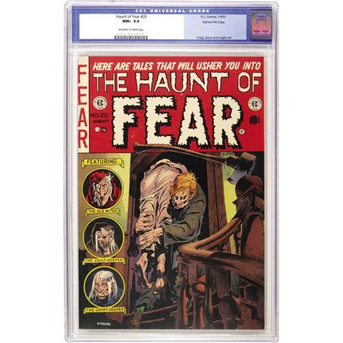 <B>Haunt of Fear #20 Gaines File pedigree 2/11 (EC, 1953) CGC NM+ 9.6 Off-white to white pages.</B></I> The detail on this Graham Ingels cover is absolutely breathtaking. His rendering of hands and feet is very distinctive, as is the linework on the wooden staircase. Johnny Craig and Jack Davis also pitch in to make this an issue to remember. With a razor-sharp cut, and perfect corners and spine, this example of Haunt of Fear #20 has garnered the highest grade CGC has given for issue #20 to date. Overstreet 2006 NM- 9.2 value = $500. CGC census 10/06: 2 in 9.6, none higher.<BR><BR><b>Shipping:</b> Slabbed Comic (<a target="_blank" href="http://www.heritageauctions.com/common/shipping.php">view shipping information</a>)
