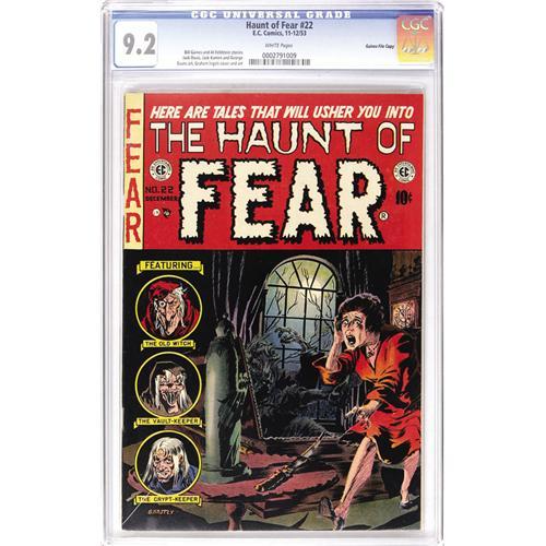 <B>Haunt of Fear #22 Gaines File pedigree 7/12 (EC, 1953) CGC NM- 9.2 White pages.</B></I> Only one 9.4 and one 9.6 top this issue in CGC's census as of this writing, and this seems to be one of those EC issues we see less often. The story "Wish You Were Here," drawn in creepy fashion by Graham Ingels, is one of the better-remembered EC yarns, and it was chosen to be adapted into the 1972 movie "Tales From The Crypt." Ingels' cover ties in to the tale. The issue also has art by George Evans, Jack Kamen, and Jack Davis. Overstreet 2006 NM- 9.2 value = $340. CGC census 6/06: 2 in 9.2, 2 higher. <BR><BR><B>Important notice:</B> Heritage usually auctions material at the rate of 200-250 lots per hour. On some occasions eBay Live bid software or the Internet may not be able to keep up with the pace of the auction. We recommend placing a realistic absentee bid now as insurance to avoid disappointment. Occasionally the auctioneer may eliminate or reject an eBay Live bid, and the auctioneer may also reopen a lot after the close of the eBay live bidding (usually because we missed an audience bid), and may reject your bid even if it shows you as the winning bidder. By bidding via eBay Live, you agree that Heritage may award the lot to another bidder at its sole discretion under the circumstances described above or any other reasonable circumstances. Since eBay bids are not shown to us until we open the lot on the floor, we treat those bids just like floor bids. In most cases the floor responds before the eBay bid is presented to us, due to Internet lag time, so for consistency we have made it a policy that floor bids are always considered first over tie eBay live bids. Also please note that all Heritage lots purchased through eBay Live carry a 22.5% Buyer's Premium. Please make sure you read the Terms and Conditions before you bid. This lot is being auctioned in conjunction with a live floor auction by Heritage Auction Galleries. All final auction and invoice information will be supplied by Heritage Auction Galleries, and all other information should be considered preliminary. Lot:41001 <BR><BR><B>Winning Notification and Billing:</B> After the FINAL session in this auction is complete, Heritage will send e-mail and snail mail invoices. This process normally takes several days. All final auction and invoice information will be supplied by Heritage Auction Galleries, and all other information should be considered preliminary. <BR><BR>This auction will be conducted on a live auction floor and over the Internet through eBay Live. If you choose to place an absentee bid, please take a moment to <font color='#0000ff'><u><a href='http://pages.ebay.com/liveauctions/help/before/laabsentee.html'>learn how eBay Live absentee bidding works</a></u></font><font color='#000000'>