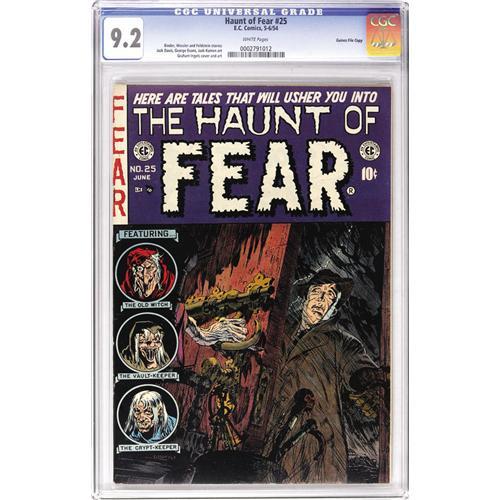 <B>Haunt of Fear #25 Gaines File pedigree 7/12 (EC, 1954) CGC NM- 9.2 White pages.</B></I> Scarcer in the highest grades than some ECs, this one is bested by only one other copy in CGC's current census. With a haunted house story the lead feature, Graham Ingels was the natural choice to draw it, and you can thrill to his horror-filled rendition on the cover as well. Jack Davis, Jack Kamen, and George Evans also contributed art to the issue. Overstreet 2006 NM- 9.2 value = $340. CGC census 6/06: 3 in 9.2, 1 higher. <BR><BR><B>Important notice:</B> Heritage usually auctions material at the rate of 200-250 lots per hour. On some occasions eBay Live bid software or the Internet may not be able to keep up with the pace of the auction. We recommend placing a realistic absentee bid now as insurance to avoid disappointment. Occasionally the auctioneer may eliminate or reject an eBay Live bid, and the auctioneer may also reopen a lot after the close of the eBay live bidding (usually because we missed an audience bid), and may reject your bid even if it shows you as the winning bidder. By bidding via eBay Live, you agree that Heritage may award the lot to another bidder at its sole discretion under the circumstances described above or any other reasonable circumstances. Since eBay bids are not shown to us until we open the lot on the floor, we treat those bids just like floor bids. In most cases the floor responds before the eBay bid is presented to us, due to Internet lag time, so for consistency we have made it a policy that floor bids are always considered first over tie eBay live bids. Also please note that all Heritage lots purchased through eBay Live carry a 22.5% Buyer's Premium. Please make sure you read the Terms and Conditions before you bid. This lot is being auctioned in conjunction with a live floor auction by Heritage Auction Galleries. All final auction and invoice information will be supplied by Heritage Auction Galleries, and all other information should be considered preliminary. Lot:41001 <BR><BR><B>Winning Notification and Billing:</B> After the FINAL session in this auction is complete, Heritage will send e-mail and snail mail invoices. This process normally takes several days. All final auction and invoice information will be supplied by Heritage Auction Galleries, and all other information should be considered preliminary. <BR><BR>This auction will be conducted on a live auction floor and over the Internet through eBay Live. If you choose to place an absentee bid, please take a moment to <font color='#0000ff'><u><a href='http://pages.ebay.com/liveauctions/help/before/laabsentee.html'>learn how eBay Live absentee bidding works</a></u></font><font color='#000000'>