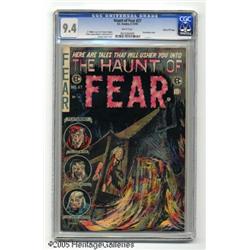 <B>Haunt of Fear #27 Gaines File pedigree 3/12 (EC, 1954) CGC NM 9.4 White pages.</B></I> "Somber time ... and the livin' is E.C." Don't blame us for that groaner, it's a direct quote from the Old Witch, who introduces a very disturbing story entitled "About Face." Meanwhile, fellow horror host the Crypt-Keeper has a cannibalism story to tell. And the series' third GhouLunatic, the Vault-Keeper, not only tells a terror tale, he's seen perusing a copy of <B>Seduction of the Innocent.</B></I> The issue's artists are regulars Graham Ingels (who also drew the cover), George Evans, Jack Kamen, and Reed Crandall. Overstreet 2004 NM- 9.2 value = $300. CGC census 12/04: 1 in 9.4, 1 higher.