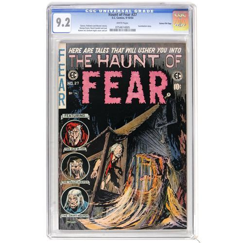 <B>Haunt of Fear #27 Gaines File pedigree 7/12 (EC, 1954) CGC NM- 9.2 White pages.</B></I> The white pages of this issue, which features a cannibalism story, are a real stand-out. Then there's the very creepy cover by Graham Ingels. On the interior art, Ingels is joined by EC greats George Evans, Reed Crandall, and Jack Kamen, and the Crypt-Keeper is shown mockingly reading a copy of <B>Seduction of the Innocent</B></I>. Overstreet 2006 NM- 9.2 value = $340. CGC census 7/06: 2 in 9.2, 2 higher. <BR><BR><B>Important notice:</B> Heritage usually auctions material at the rate of 200-250 lots per hour. On some occasions eBay Live bid software or the Internet may not be able to keep up with the pace of the auction. We recommend placing a realistic absentee bid now as insurance to avoid disappointment. Occasionally the auctioneer may eliminate or reject an eBay Live bid, and the auctioneer may also reopen a lot after the close of the eBay live bidding (usually because we missed an audience bid), and may reject your bid even if it shows you as the winning bidder. By bidding via eBay Live, you agree that Heritage may award the lot to another bidder at its sole discretion under the circumstances described above or any other reasonable circumstances. Since eBay bids are not shown to us until we open the lot on the floor, we treat those bids just like floor bids. In most cases the floor responds before the eBay bid is presented to us, due to Internet lag time, so for consistency we have made it a policy that floor bids are always considered first over tie eBay live bids. Also please note that all Heritage lots purchased through eBay Live carry a 22.5% Buyer's Premium. Please make sure you read the Terms and Conditions before you bid. This lot is being auctioned in conjunction with a live floor auction by Heritage Auction Galleries. All final auction and invoice information will be supplied by Heritage Auction Galleries, and all other information should be considered preliminary. Lot:41001 <BR><BR><B>Winning Notification and Billing:</B> After the FINAL session in this auction is complete, Heritage will send e-mail and snail mail invoices. This process normally takes several days. All final auction and invoice information will be supplied by Heritage Auction Galleries, and all other information should be considered preliminary. <BR><BR>This auction will be conducted on a live auction floor and over the Internet through eBay Live. If you choose to place an absentee bid, please take a moment to <font color='#0000ff'><u><a href='http://pages.ebay.com/liveauctions/help/before/laabsentee.html'>learn how eBay Live absentee bidding works</a></u></font><font color='#000000'>