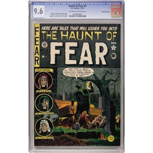 <B>Haunt of Fear #5 Gaines File pedigree (EC, 1951) CGC NM+ 9.6 Off-white to white pages.</B></I> Don't be looking for a higher-graded copy -- CGC hasn't certified one higher than this to date. Johnny Craig continued his tenure as cover artist, and also provided interior art along with Graham Ingels, Wally Wood, and Jack Davis. The Wood story has an injury-to-eye panel -- always a fun event! While CGC has certified this as a Gaines File Copy, no certificate accompanies the book. Overstreet 2007 NM- 9.2 value = $950. CGC census 5/07: 4 in 9.6, none higher.<BR><BR><b>Shipping:</b> Comics - Slabbed (certified) (<a target="_blank" href="http://www.heritageauctions.com/common/shipping.php">view shipping information</a>)
