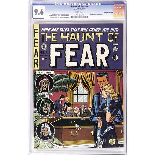 <B>Haunt of Fear #6 Gaines File pedigree (EC, 1951) CGC NM+ 9.6 White pages.</B></I> This issue features EC's first of several unauthorized adaptations of Ray Bradbury stories (Bradbury became aware of the swiping after a while, and the two sides agreed on an adaptation fee for the future). This book's lead story, based on Bradbury's "The Handler," has Graham Ingels art. Other artists in the issue include Johnny Craig (cover), Wally Wood, Jack Kamen, and Jack Davis. Note that while CGC has certified this book as a Gaines File Copy, no certificate accompanies this lot. Overstreet 2006 NM- 9.2 value = $650. CGC census 5/06: 3 in 9.6, 1 higher. <BR><BR><B>Important notice:</B> Heritage usually auctions material at the rate of 200-250 lots per hour. On some occasions eBay Live bid software or the Internet may not be able to keep up with the pace of the auction. We recommend placing a realistic absentee bid now as insurance to avoid disappointment. Occasionally the auctioneer may eliminate or reject an eBay Live bid, and the auctioneer may also reopen a lot after the close of the eBay live bidding (usually because we missed an audience bid), and may reject your bid even if it shows you as the winning bidder. By bidding via eBay Live, you agree that Heritage may award the lot to another bidder at its sole discretion under the circumstances described above or any other reasonable circumstances. Since eBay bids are not shown to us until we open the lot on the floor, we treat those bids just like floor bids. In most cases the floor responds before the eBay bid is presented to us, due to Internet lag time, so for consistency we have made it a policy that floor bids are always considered first over tie eBay live bids. Also please note that all Heritage lots purchased through eBay Live carry a 22.5% Buyer's Premium. Please make sure you read the Terms and Conditions before you bid. This lot is being auctioned in conjunction with a live floor auction by Heritage Auction Galleries. All final auction and invoice information will be supplied by Heritage Auction Galleries, and all other information should be considered preliminary. Lot:41001 <BR><BR><B>Winning Notification and Billing:</B> After the FINAL session in this auction is complete, Heritage will send e-mail and snail mail invoices. This process normally takes several days. All final auction and invoice information will be supplied by Heritage Auction Galleries, and all other information should be considered preliminary. <BR><BR>This auction will be conducted on a live auction floor and over the Internet through eBay Live. If you choose to place an absentee bid, please take a moment to <font color='#0000ff'><u><a href='http://pages.ebay.com/liveauctions/help/before/laabsentee.html'>learn how eBay Live absentee bidding works</a></u></font><font color='#000000'>