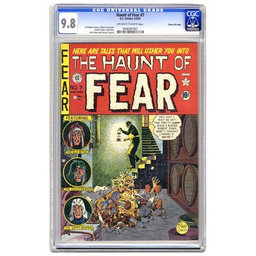 <B>Haunt of Fear #7 Gaines File pedigree 3/12 (EC, 1951) CGC NM/MT 9.8 Off-white to white pages.</B></I> Here's a spectacular copy of this horror mag. The issue has the Old Witch spinning two yarns and her fellow GhouLunatics, the Vault-Keeper and the Crypt-Keeper, telling one tale each. Johnny Craig's cover ties into a Graham Ingels-drawn tale about a youngster obsessed with getting the last available spot in the family mausoleum. But instead of choosing suicide, he chooses murder... Craig, Jack Davis, and Jack Kamen also contributed art to the issue. Overstreet 2005 NM- 9.2 value = $610. CGC census 12/05: 4 in 9.8, none higher.