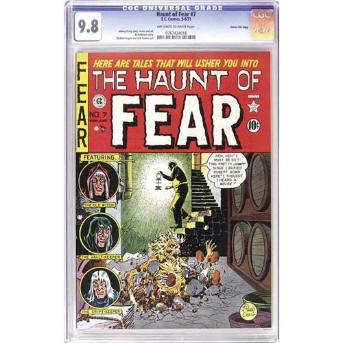 <B>Haunt of Fear #7 Gaines File pedigree (EC, 1951) CGC NM/MT 9.8 Off-white to white pages.</B></I> EC fans are passionate about this Johnny Craig cover, as evidenced by the fact that the original art sold for top dollar in a recent auction (a Heritage auction, we immodestly admit)! The cover ties into a tale of horror, terror, and murder drawn by Graham Ingels. There's also interior art by Craig, Jack Davis, and Jack Kamen. Note that while CGC has certified this book as a Gaines File Copy, no certificate accompanies this lot. Overstreet 2006 NM- 9.2 value = $650. CGC census 5/06: 5 in 9.8, none higher. <BR><BR><B>Important notice:</B> Heritage usually auctions material at the rate of 200-250 lots per hour. On some occasions eBay Live bid software or the Internet may not be able to keep up with the pace of the auction. We recommend placing a realistic absentee bid now as insurance to avoid disappointment. Occasionally the auctioneer may eliminate or reject an eBay Live bid, and the auctioneer may also reopen a lot after the close of the eBay live bidding (usually because we missed an audience bid), and may reject your bid even if it shows you as the winning bidder. By bidding via eBay Live, you agree that Heritage may award the lot to another bidder at its sole discretion under the circumstances described above or any other reasonable circumstances. Since eBay bids are not shown to us until we open the lot on the floor, we treat those bids just like floor bids. In most cases the floor responds before the eBay bid is presented to us, due to Internet lag time, so for consistency we have made it a policy that floor bids are always considered first over tie eBay live bids. Also please note that all Heritage lots purchased through eBay Live carry a 22.5% Buyer's Premium. Please make sure you read the Terms and Conditions before you bid. This lot is being auctioned in conjunction with a live floor auction by Heritage Auction Galleries. All final auction and invoice information will be supplied by Heritage Auction Galleries, and all other information should be considered preliminary. Lot:41001 <BR><BR><B>Winning Notification and Billing:</B> After the FINAL session in this auction is complete, Heritage will send e-mail and snail mail invoices. This process normally takes several days. All final auction and invoice information will be supplied by Heritage Auction Galleries, and all other information should be considered preliminary. <BR><BR>This auction will be conducted on a live auction floor and over the Internet through eBay Live. If you choose to place an absentee bid, please take a moment to <font color='#0000ff'><u><a href='http://pages.ebay.com/liveauctions/help/before/laabsentee.html'>learn how eBay Live absentee bidding works</a></u></font><font color='#000000'>