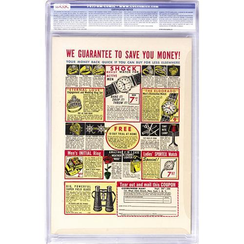 50. Since we cannot examine encapsulated notes or comics, they are sold "as is" without our grading opinion, and may not be returned for any reason. Auctioneer shall not be liable for any patent or latent defect or controversy pertaining to or arising from any encapsulated collectible. In any such instance, purchaser's remedy, if any, shall be solely against the service certifying the collectible.