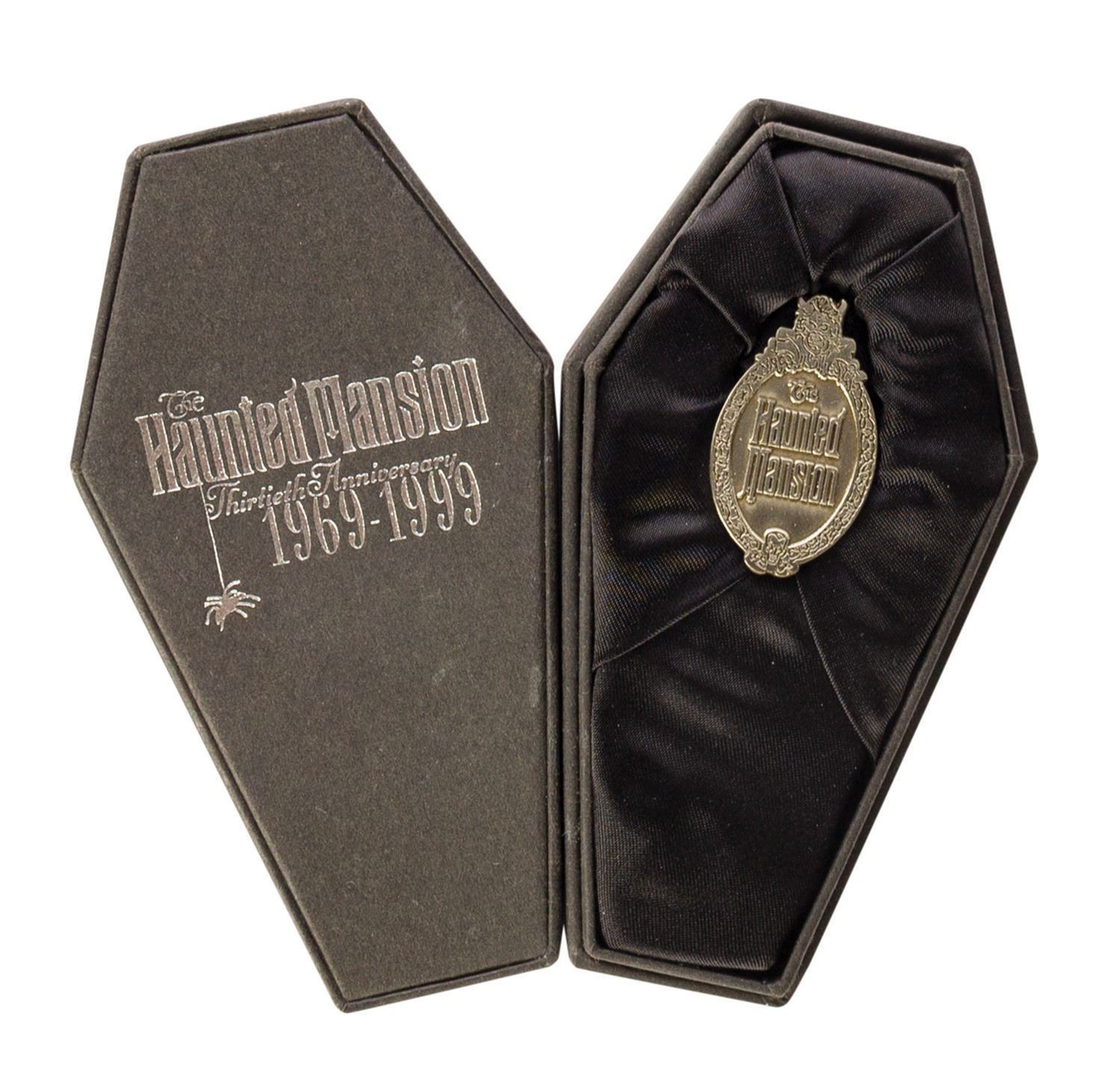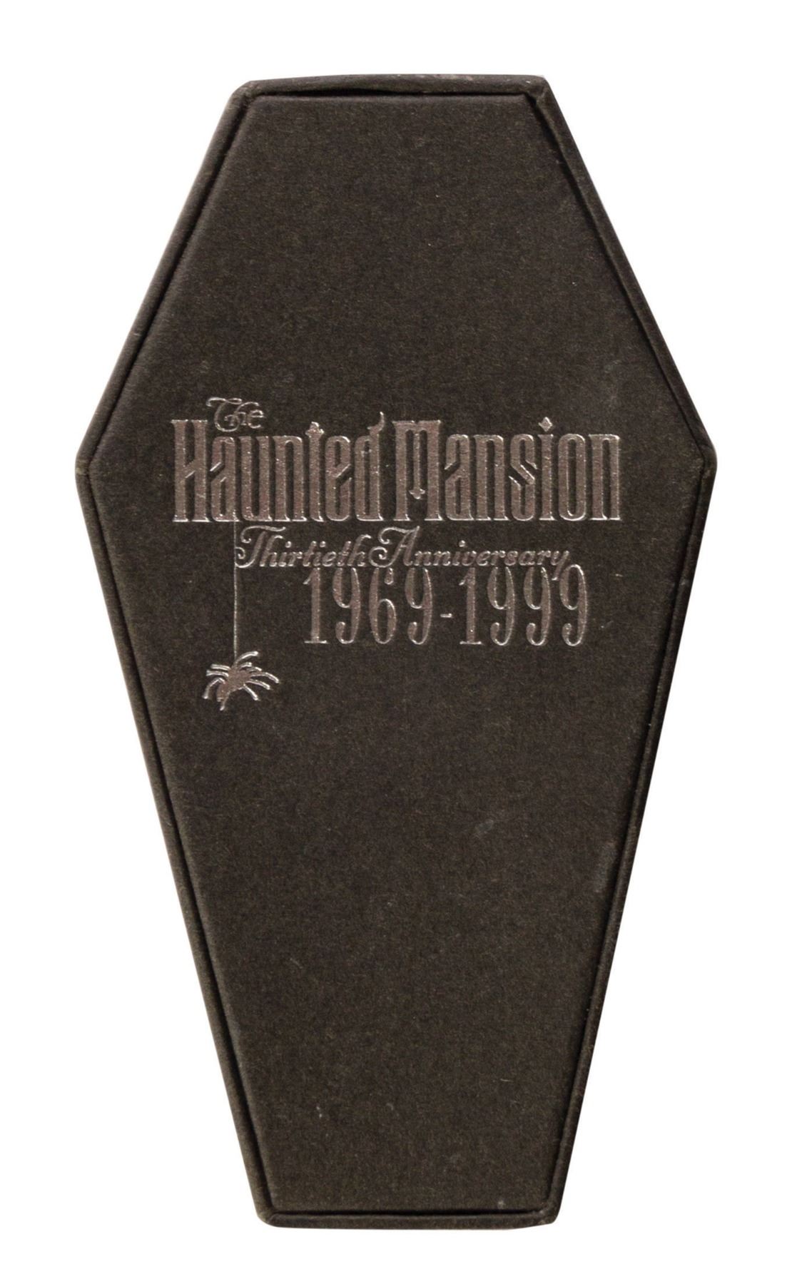 (Disneyland, 1999) A special limited edition pin created to celebrate the 30th anniversary of the Haunted Mansion. The commemorative pin was created in a limited edition of only 1969 pieces. The coffin-shaped box that holds the pin has a silver foil embossing that reads "The Haunted Mansion Thirtieth Anniversary 1969-1999." Measuring approximately 1.5"x1" in its 4.75" long coffin box, the pin is in fine condition with minor scuffs to the outside of the box.