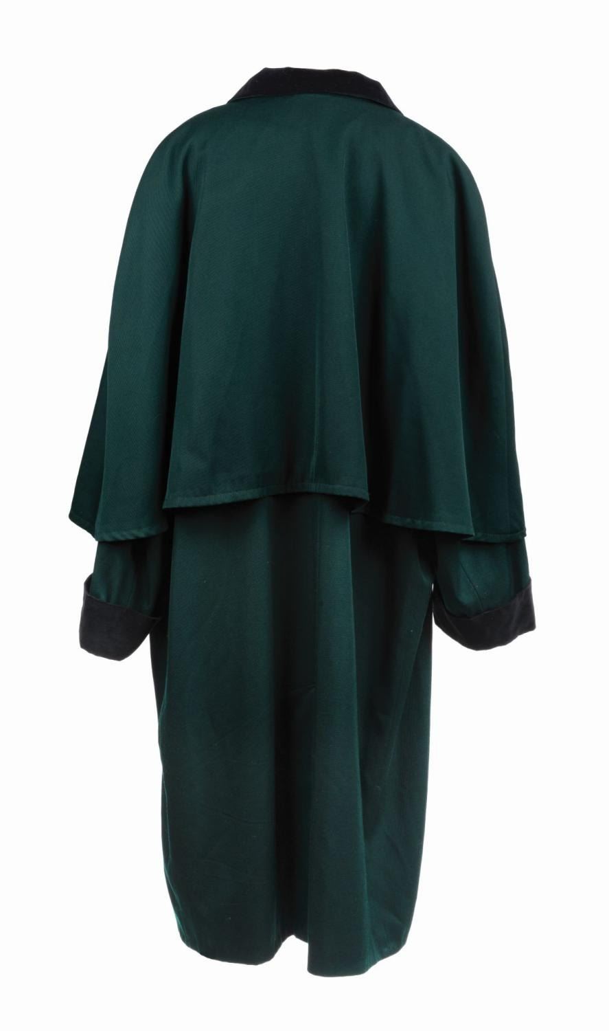 (Disneyland, c.2000s) A very rare cast member cloak from Disneyland's Haunted Mansion. Designed with the mansion's familiar green and black color scheme, the cloak includes a shoulder cape which is attached along the neckline. The cloak maintains its interior Disneyland wardrobe tag and is marked as a size 2XL. The condition is very good with minor wear from use.