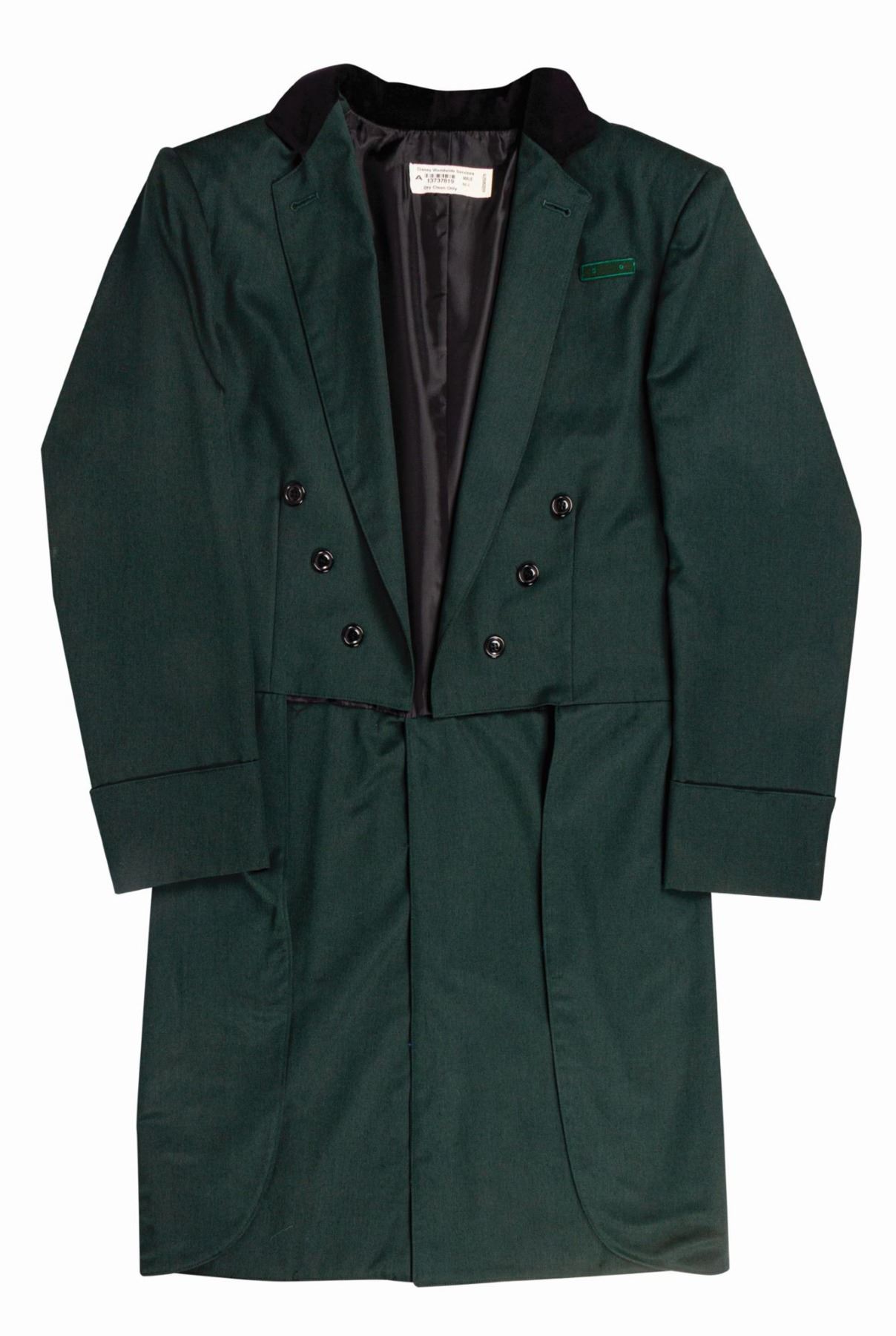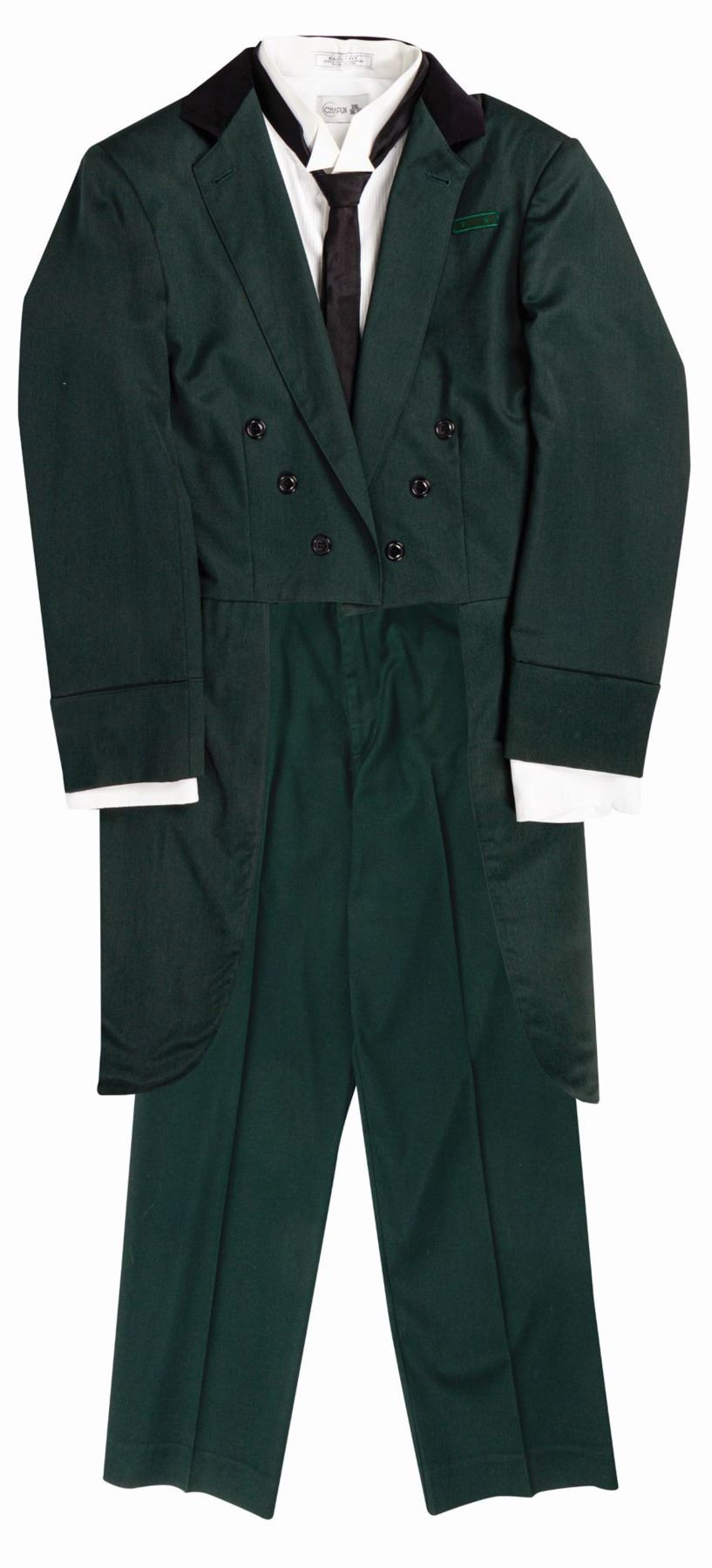 (Walt Disney World, 1990s) An original male cast member costume for the Haunted Mansion attraction at Walt Disney World. This costume includes the coat, vest, shirt, tie, and pants. The articles of clothing still retain their Disney wardrobe tags, and the vest features gold-tone Cinderella Castle embossed buttons. The coat is size 42L, the vest is size 38M, the shirt is marked 36-37, and the pants are size 38x28. This outfit is in very good condition overall, with minor wear from use.
