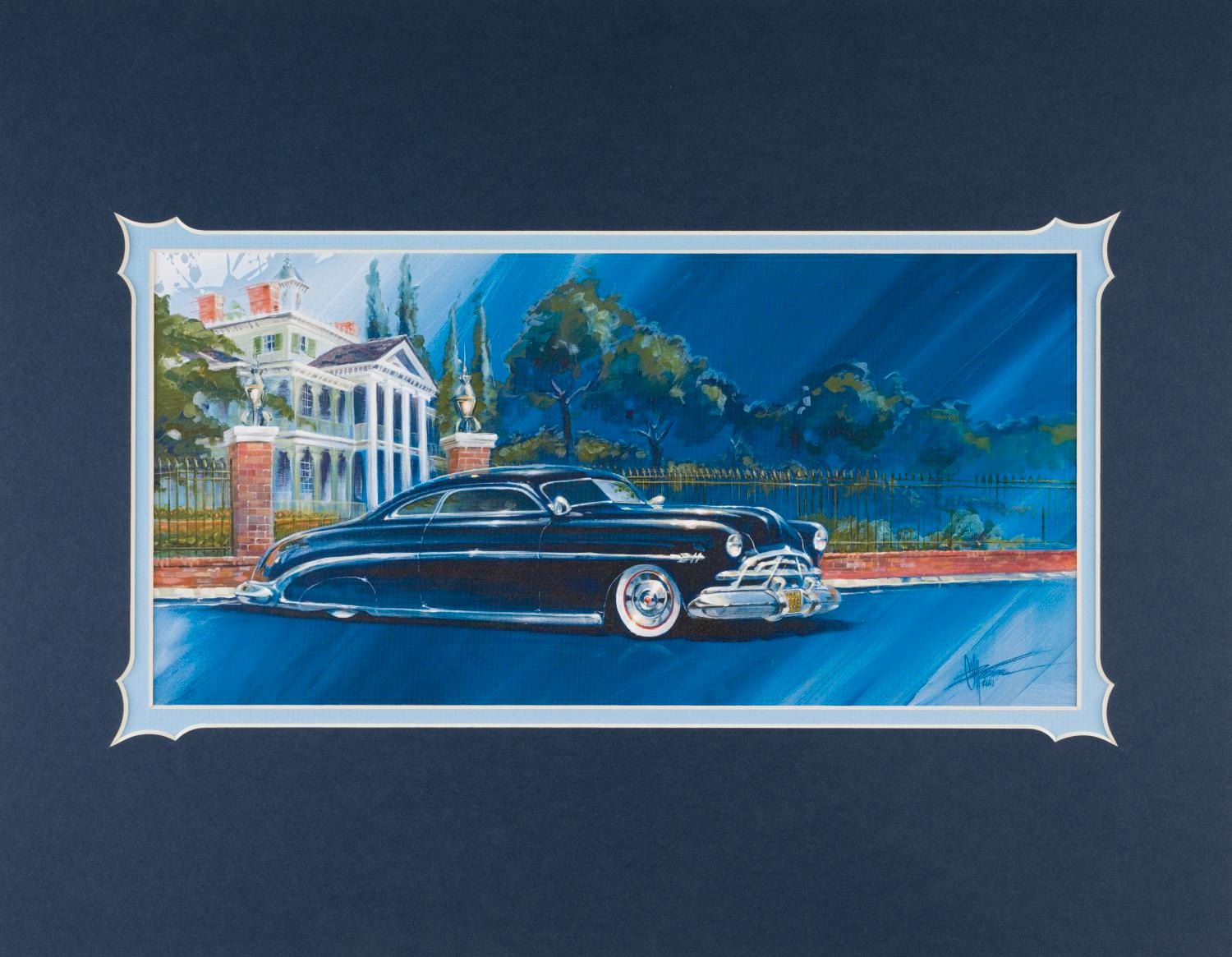 (The Art of Disney Theme Parks, 2011) A Haunted Mansion print titled "Doc's House Call" by legendary automobile designer, Chip Foose. The piece has an image size of 13.25" x 6.5" within its 18" x 14" matte and is in fine condition.
