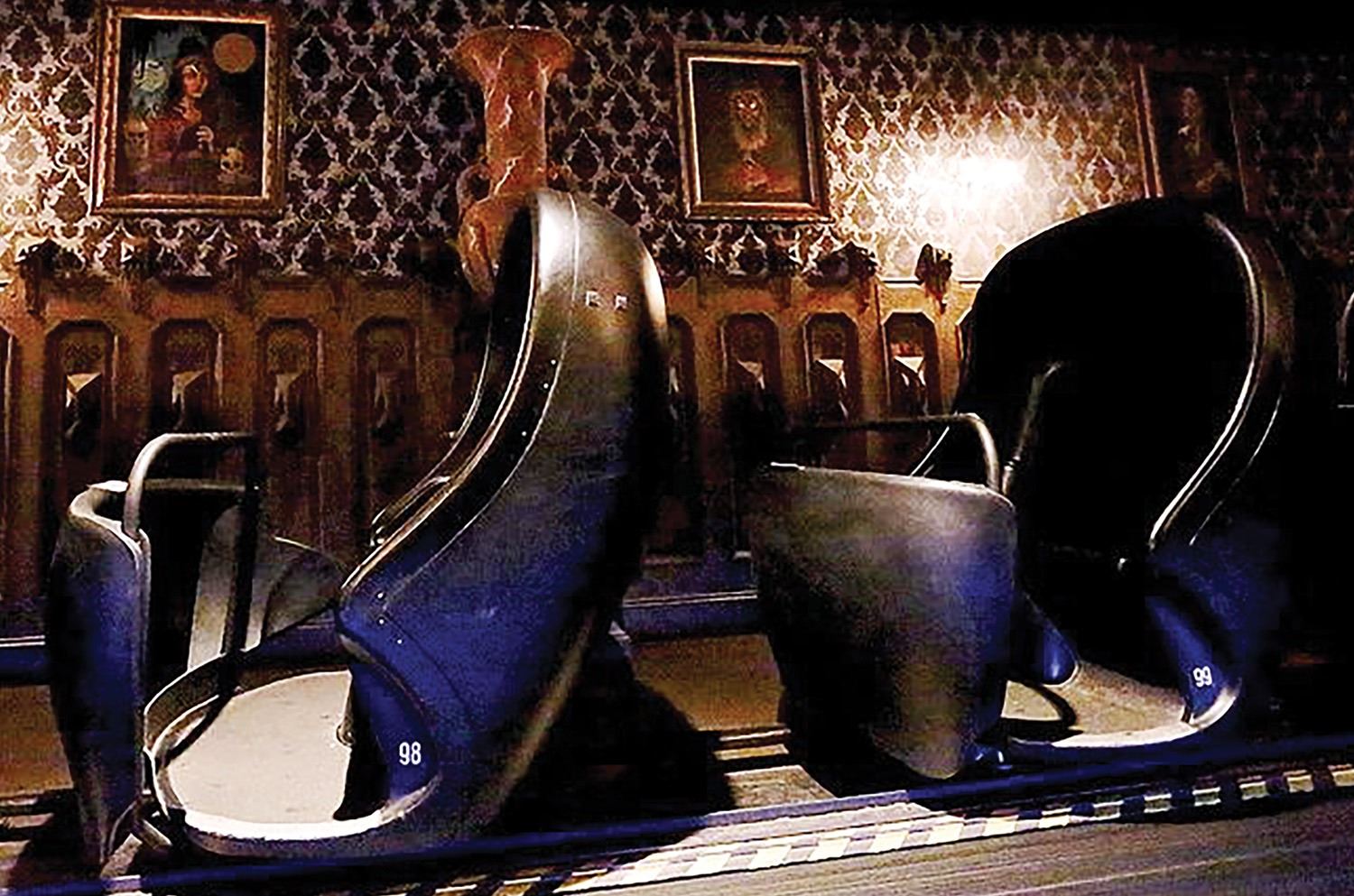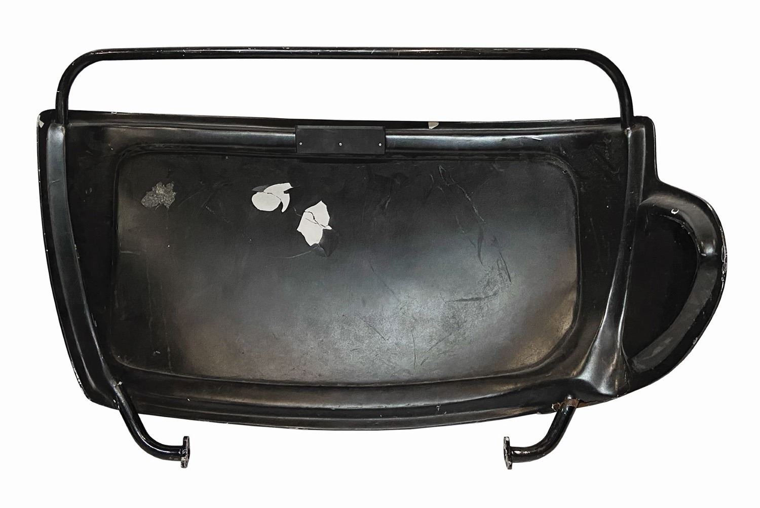 (Walt Disney World, c.1980s) An original door from one of the Haunted Mansion's iconic "Doom Buggy" Omnimover vehicles. Composed of painted fiberglass, these familiar doors would open and close automatically with help from the attraction's Ghost Host. The door measures 33" tall, 52" long, and is in poor to fair condition with cracks, chips in the paint, and scratches throughout. Original pieces of attraction vehicles are rare in their own right, with a large section from a Doom Buggy such as this being an exceptionally rare and desirable Haunted Mansion artifact.