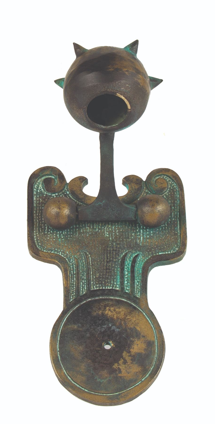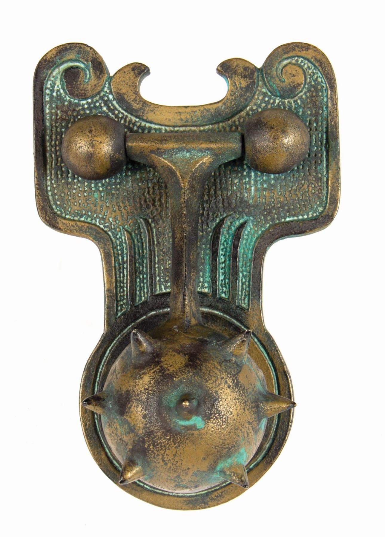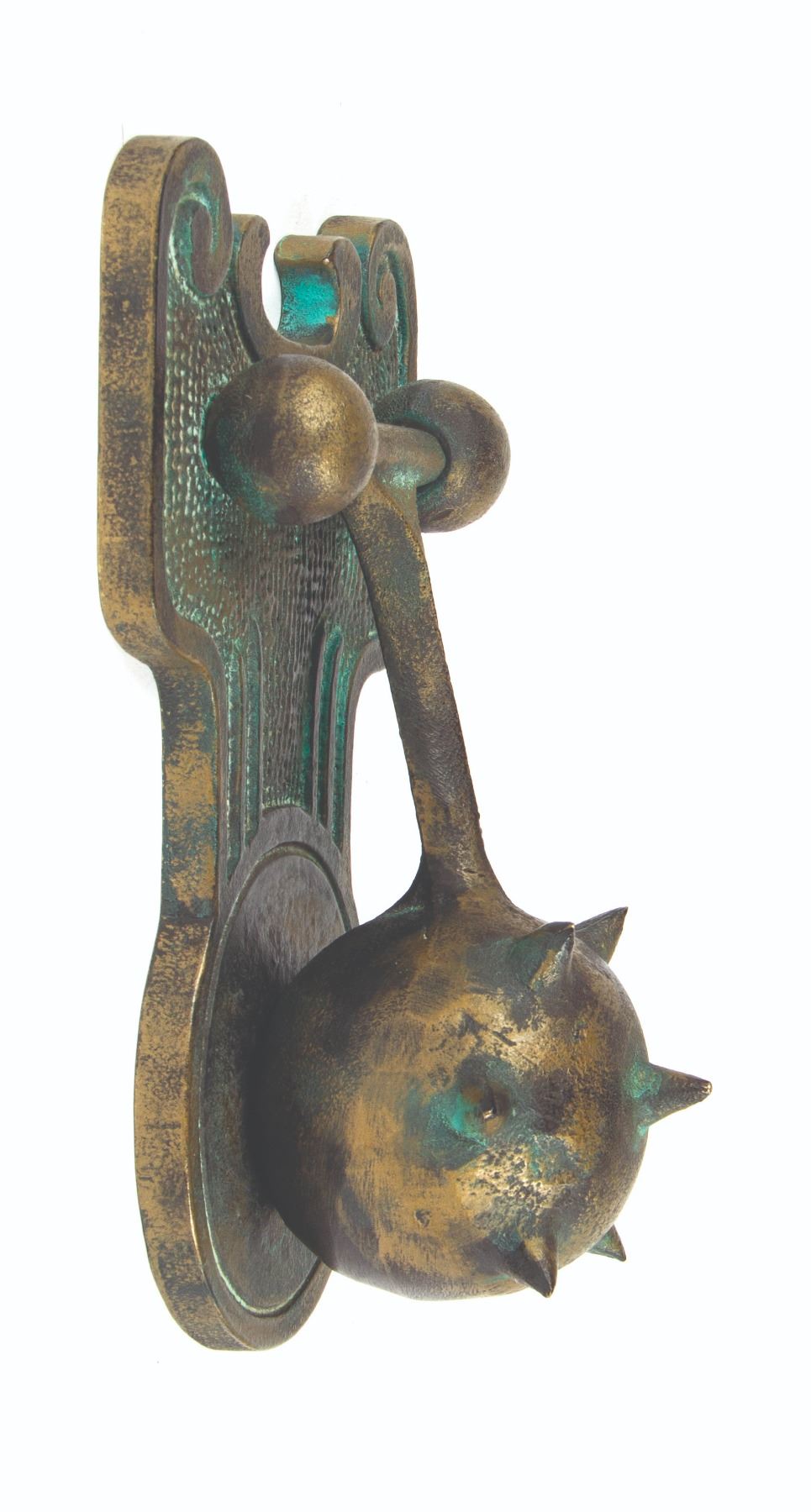 (Disneyland, c.1970s-80s) An original prop door knocker from Disneyland's Haunted Mansion. The prop is cast in metal so that when animated (through a small hole in the mount) it would create a realistic "knocking" sound. The prop is a functional and exceptionally rare artifact from the attraction's iconic Corridor of Doors. Measuring 7"x4.75" and 3" deep, the prop is in very good condition.