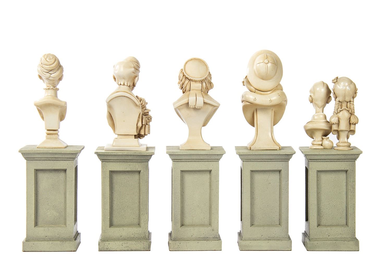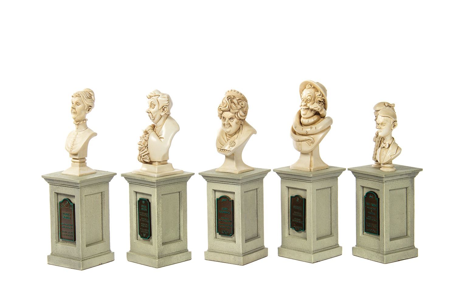 (Walt Disney World, c.2010s) A set of (5) miniature busts from the Haunted Mansion. The busts depict the six Dread Family members: Bertie, Uncle Jacob, Aunt Florence, Cousin Maude, and the twins Wellington and Forsythia. Life-size versions of these busts were installed at Walt Disney World's Haunted Mansion attraction as part of an interactive “who-killed-who†game to be played in line. These busts measure approximately 9" tall with some variance in size, and the set is in very fine condition. The busts come in their original box and packaging.