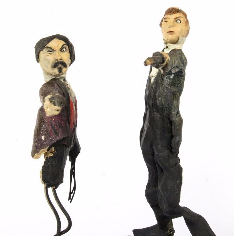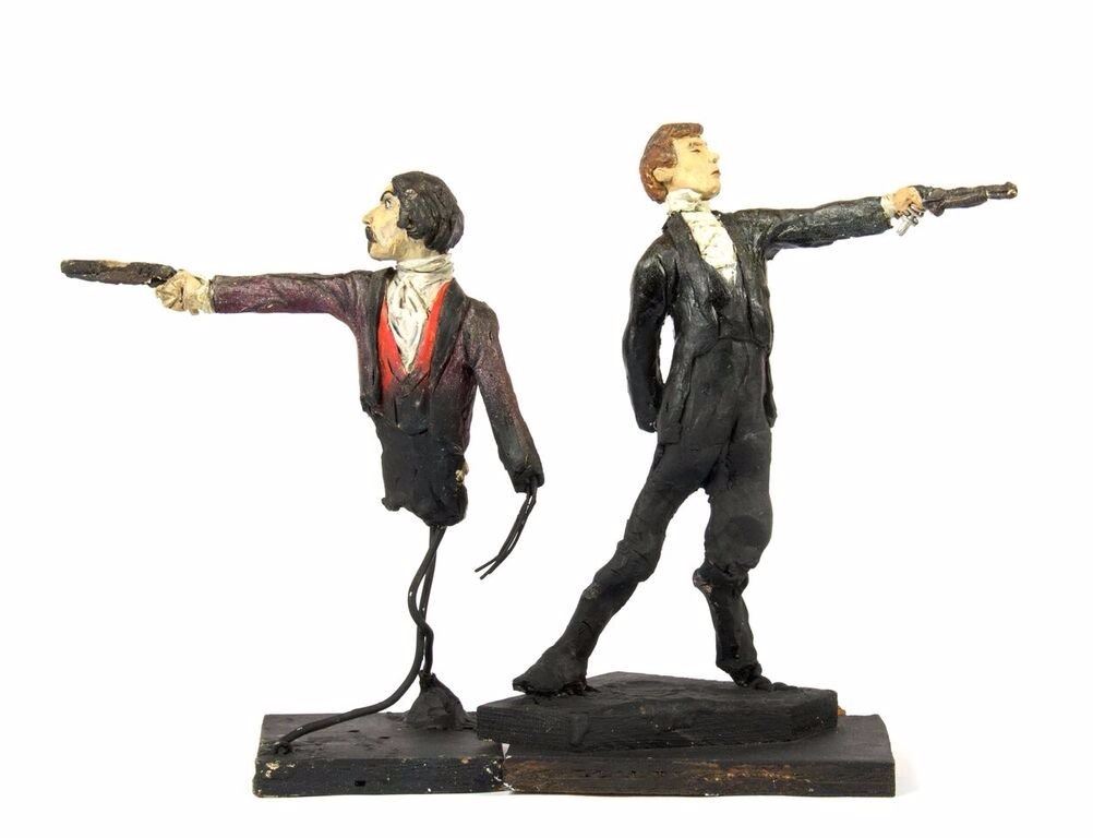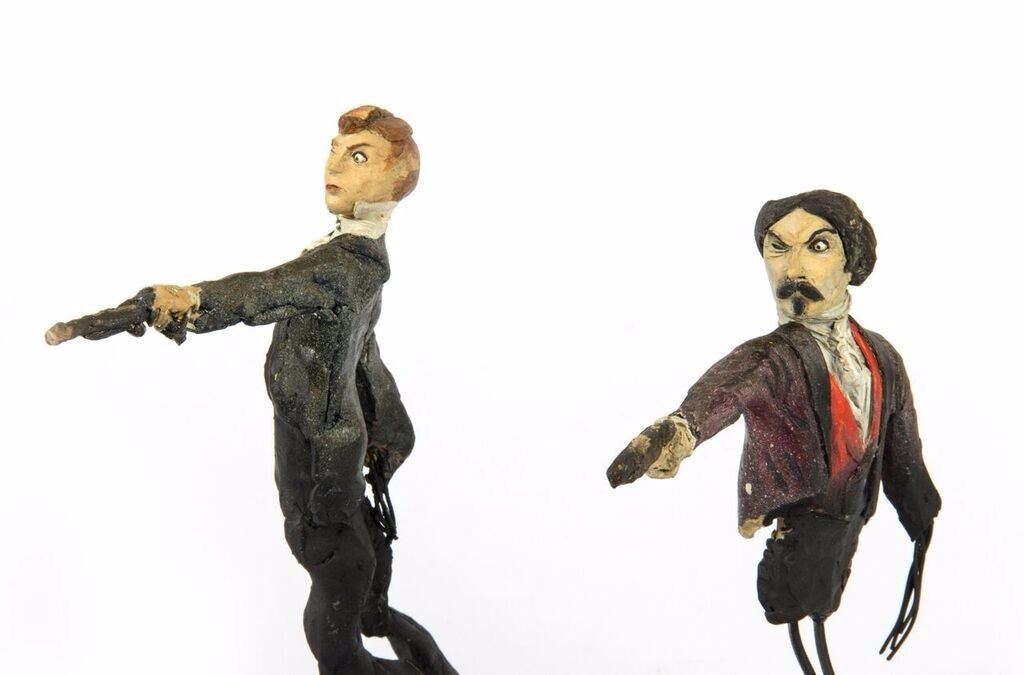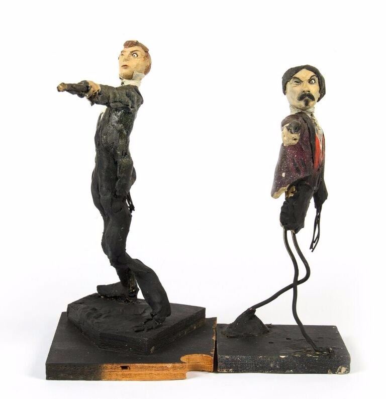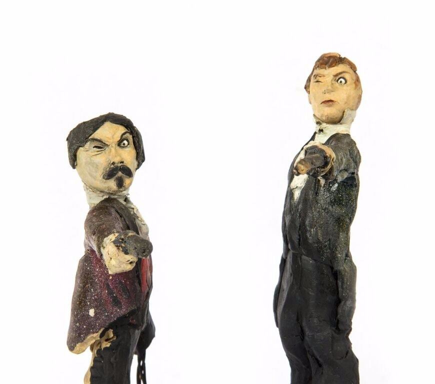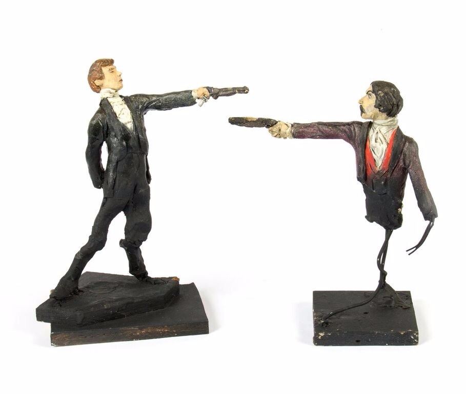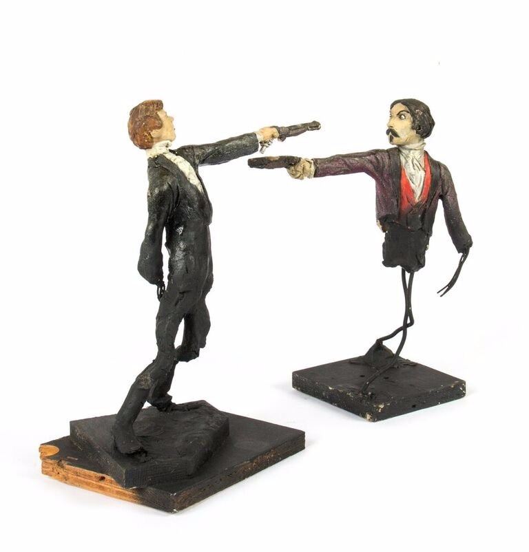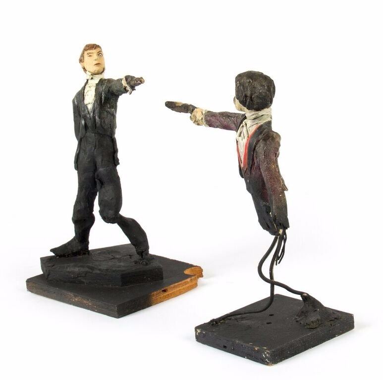 (Disneyland, c.1967) An original pair of maquettes used in the creation of the "Haunted Mansion" at Disneyland. These maquettes feature the dueling ghosts from the portraits in The Grand Ballroom scene of the attraction. In The Grand Ballroom, these men continue their duel-to-the-death even in the afterlife, and these maquettes feature the two stoic duelists, ready to fire. Each maquette measures approximately 10" tall and the pair are in fair to good condition with a few missing pieces and some wear from age. Minor restoration has been done to the legs of one of the maquettes to aid in its presentation.