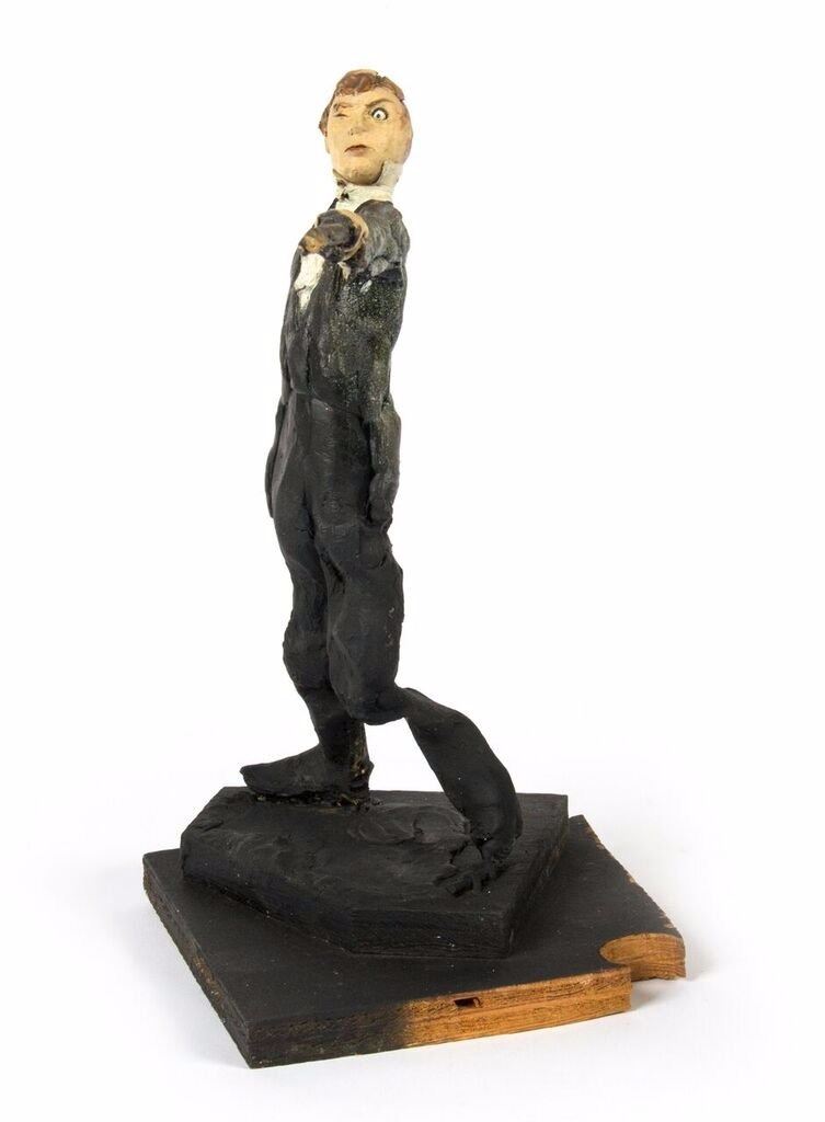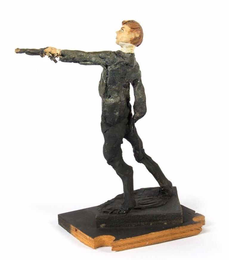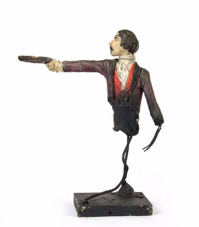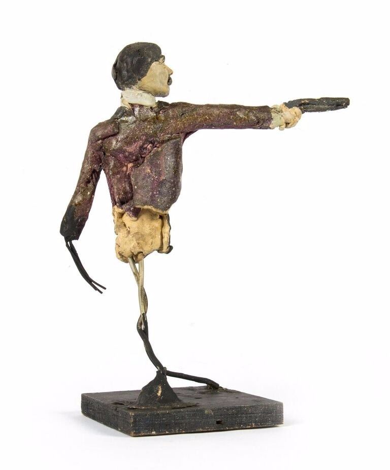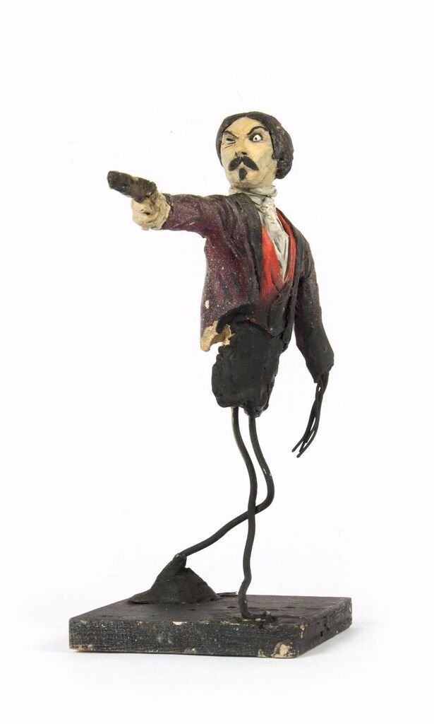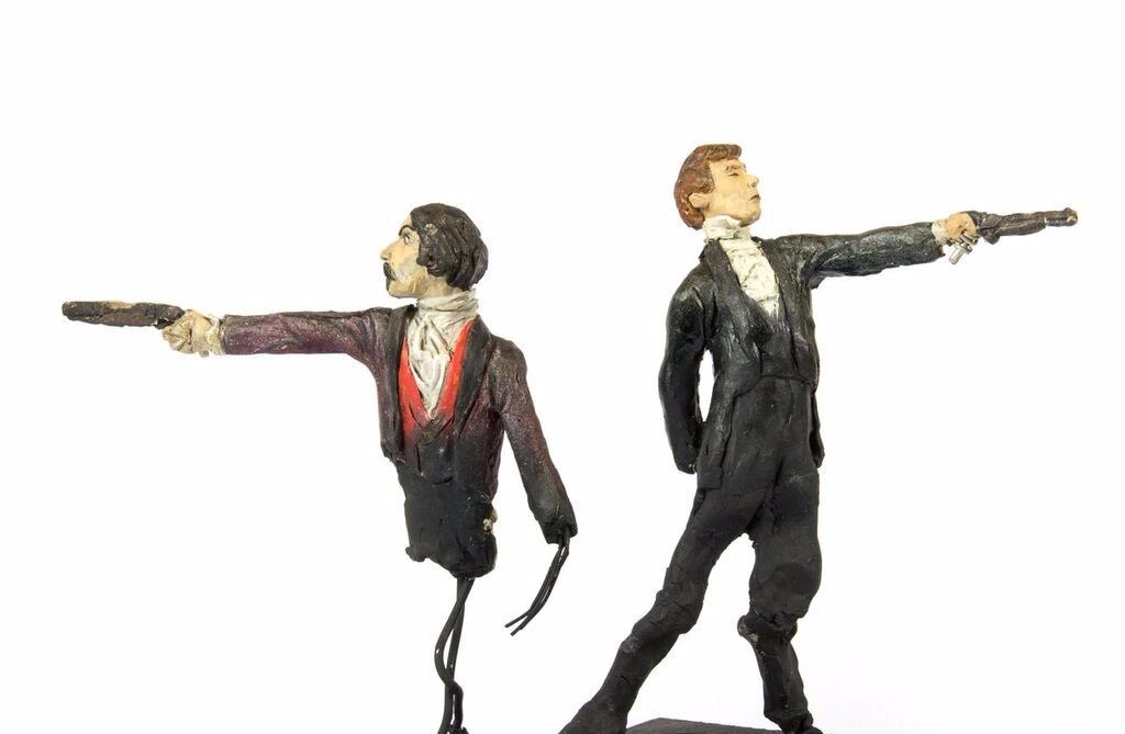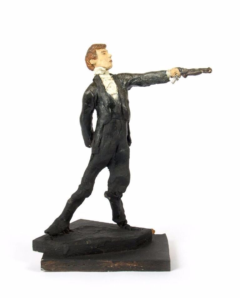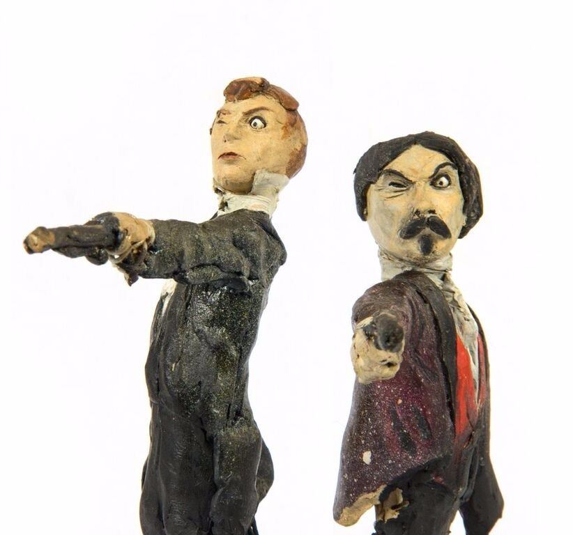 (Disneyland, c.1967) An original pair of maquettes used in the creation of the "Haunted Mansion" at Disneyland. These maquettes feature the dueling ghosts from the portraits in The Grand Ballroom scene of the attraction. In The Grand Ballroom, these men continue their duel-to-the-death even in the afterlife, and these maquettes feature the two stoic duelists, ready to fire. Each maquette measures approximately 10" tall and the pair are in fair to good condition with a few missing pieces and some wear from age. Minor restoration has been done to the legs of one of the maquettes to aid in its presentation.