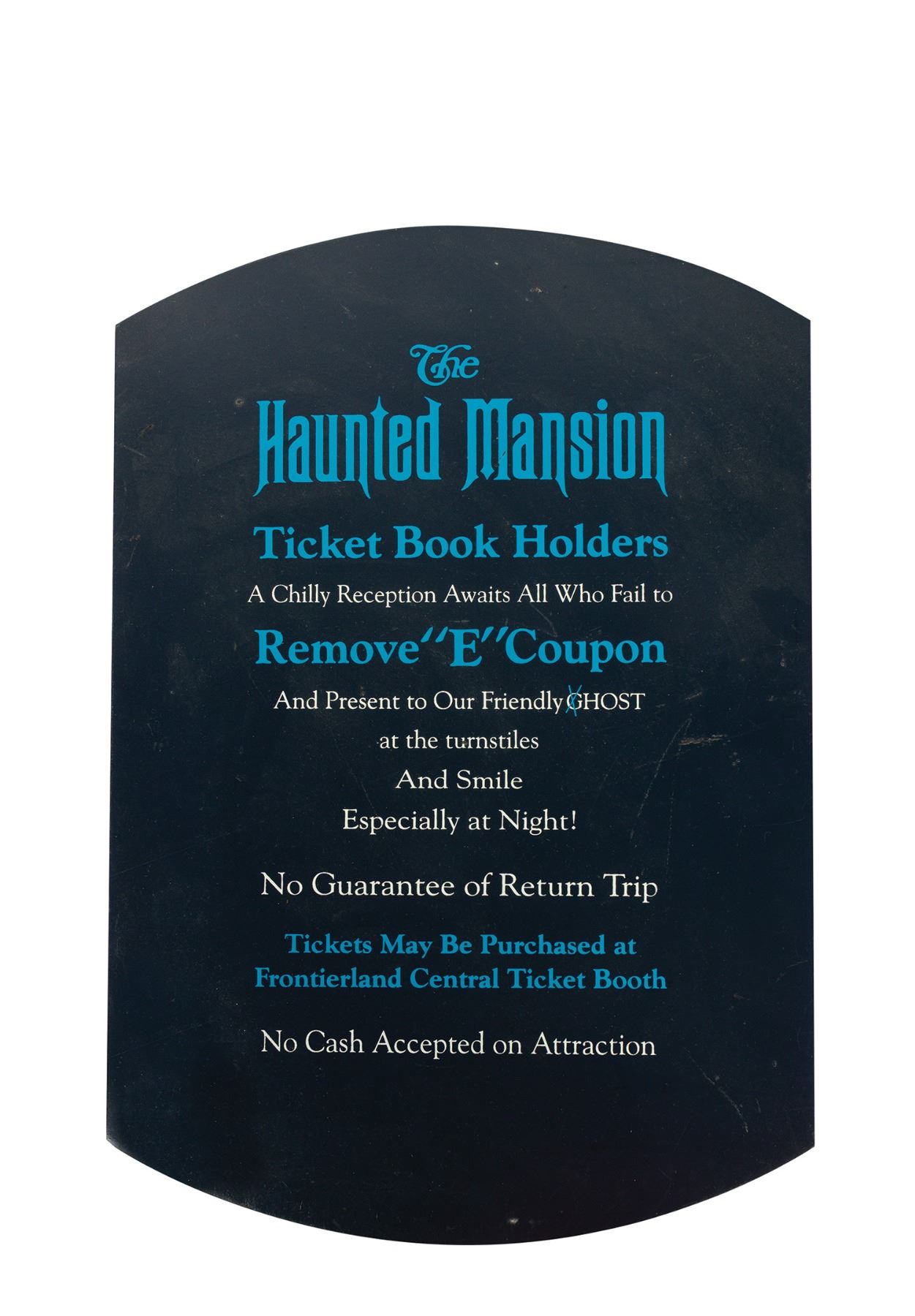(Disneyland, c.1990s) A collector-made replica of the "E Ticket" ride coupon sign from Disneyland's Haunted Mansion. The use of ticket books is a significant part of Disneyland's history, and this replica sign beautifully captures the Haunted Mansion's status as one of the most popular "E Ticket" attractions. This collector-made replica was created using the original blueprint specifications for the park-used sign, and was silkscreened on board. Measuring 17.75"x12.25", the sign is in good condition with some scuffs and minor surface wear throughout.