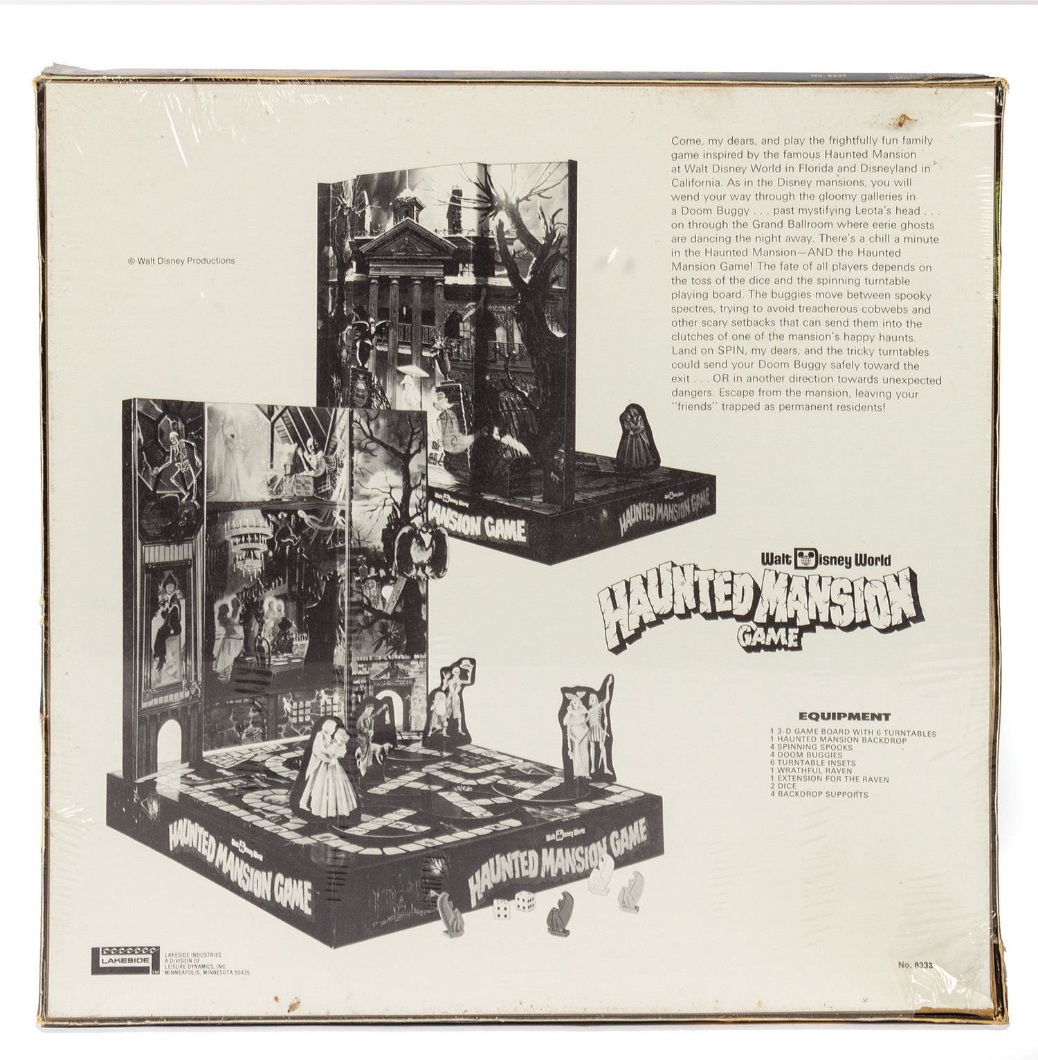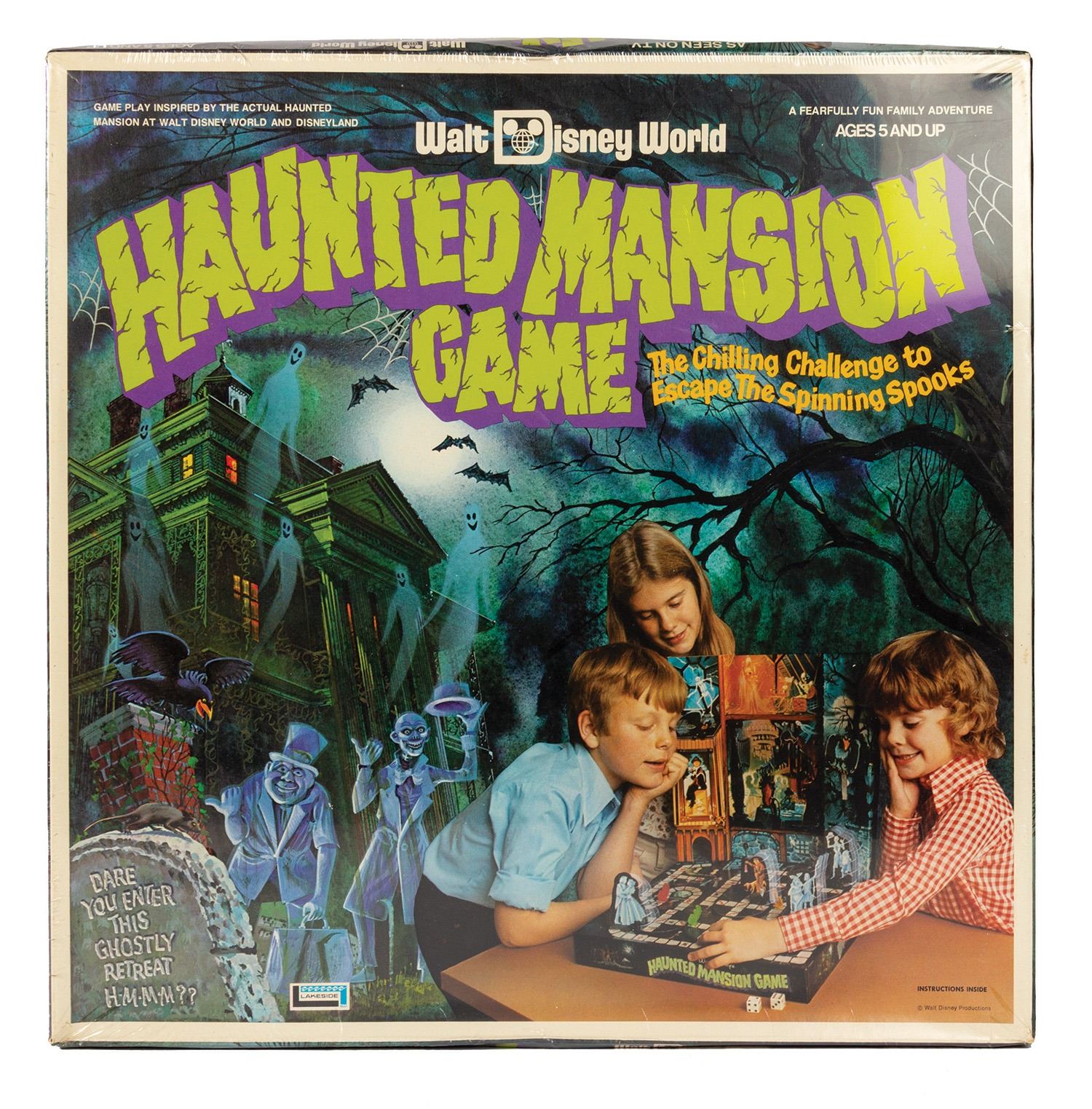 (Walt Disney World, 1970s) An unopened Walt Disney World Haunted Mansion board game. This board game features many scenes and ghoulish characters from the iconic attraction and is difficult to find in any condition, with an unopened version being exceptionally rare. The box measures 15.5"x15" and is in very good condition, still wrapped in plastic, with minor edge and corner wear to the box.