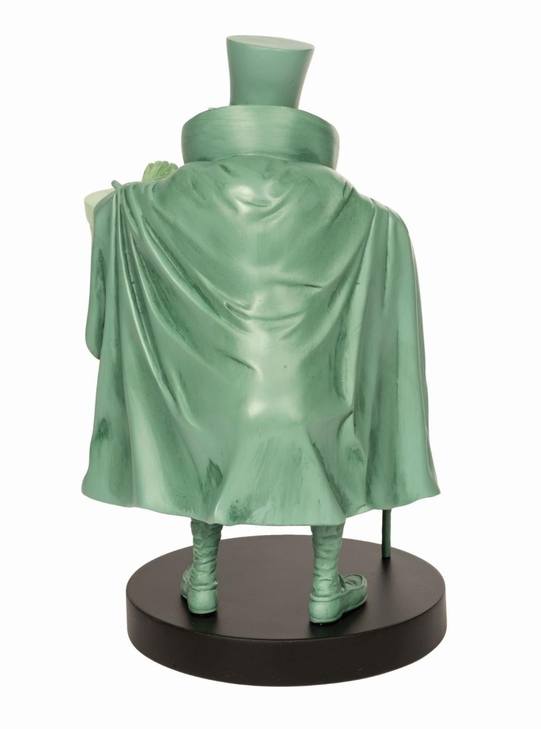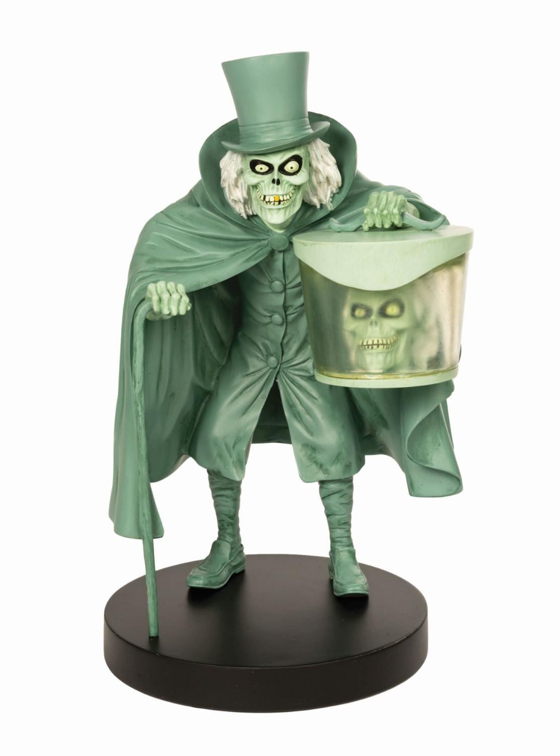 (Disneyland, c.2010s) A wonderful figure created by artist Costa Alavezos depicting the Hatbox Ghost from the Haunted Mansion. Created in resin, the detailed figure displays a second ghoulish head within the clear hatbox. Measuring 12" tall on the bas, the figure is in very fine condition and comes in its original box.