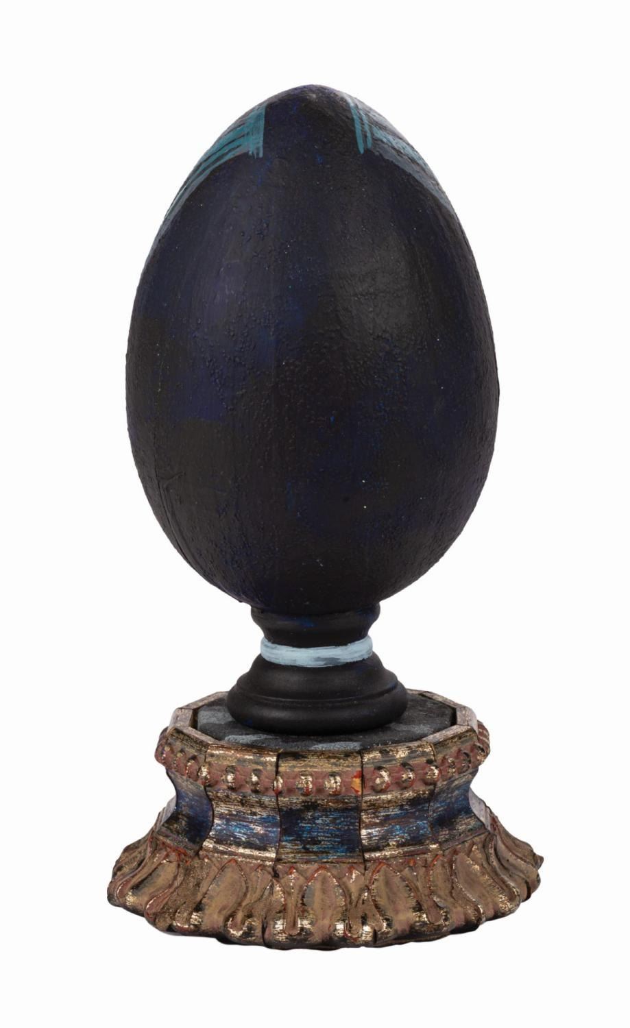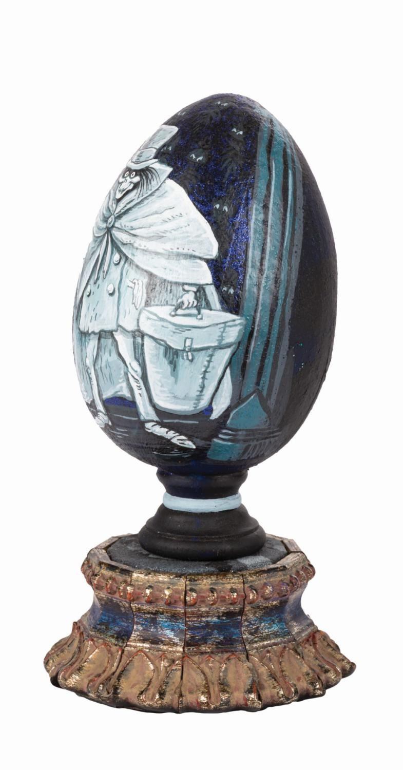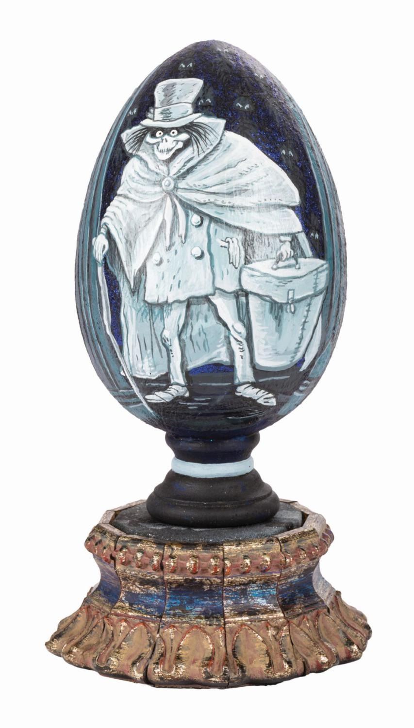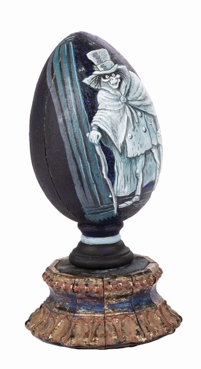 (Disneyland, 2015) A hand-painted Hatbox Ghost Easter egg prop from Disneyland. This eqq was expertly painted by artist Bridget McCarty and displayed at the Springtime Roundup in the Big Thunder Ranch Jamboree. The large egg prop depicts the Hatbox Ghost on the front, with the Mansion's attraction building on the reverse. It stands 8.5" tall, including the base. The condition is very good with two thin cracks at the back where the seam is slightly visible.