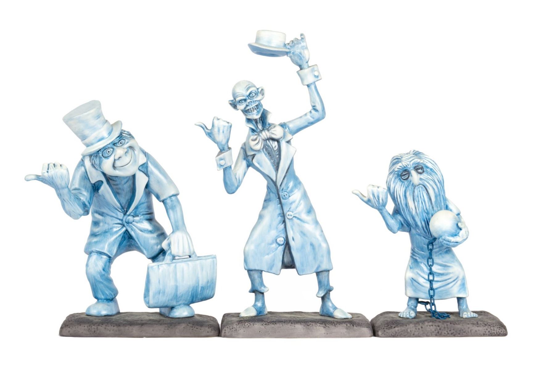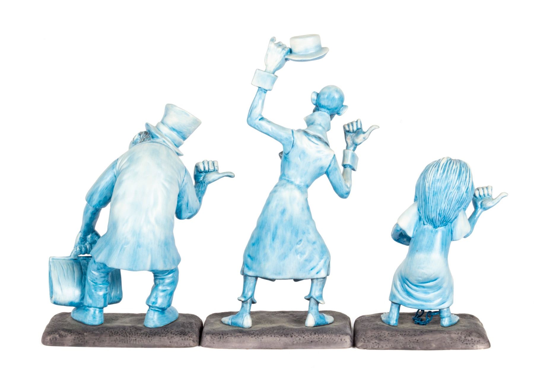 (WDCC, 1999) An extremely rare set of Walt Disney Classics Collection figures that depict the iconic Hitchhiking Ghosts from the Haunted Mansion. These hand-painted ceramic figures are part of a limited edition set, with each figure hand-numbered on the base as 876/1500. The figures range in size from 5" to 8.25" tall and the condition is very fine overall. The original box and hand-numbered Certificate of Authenticity are included.