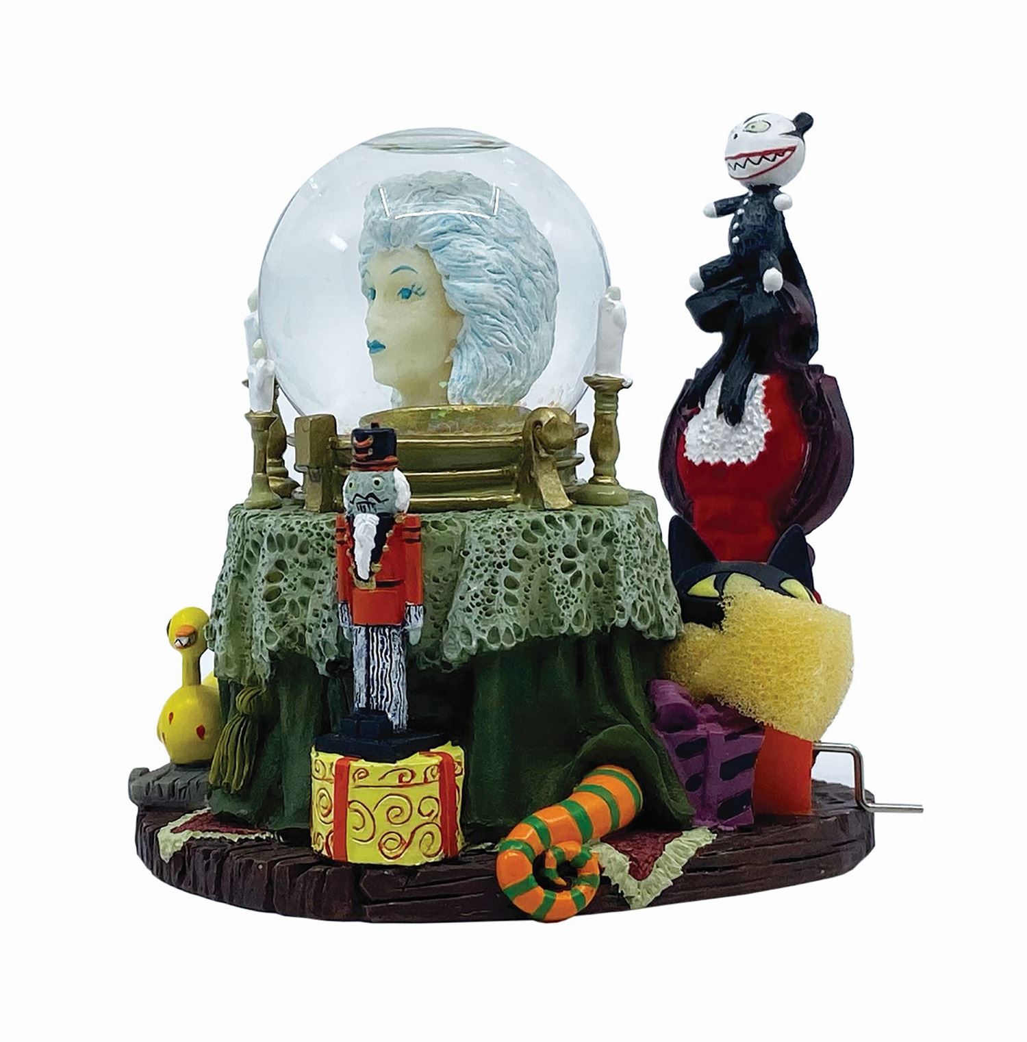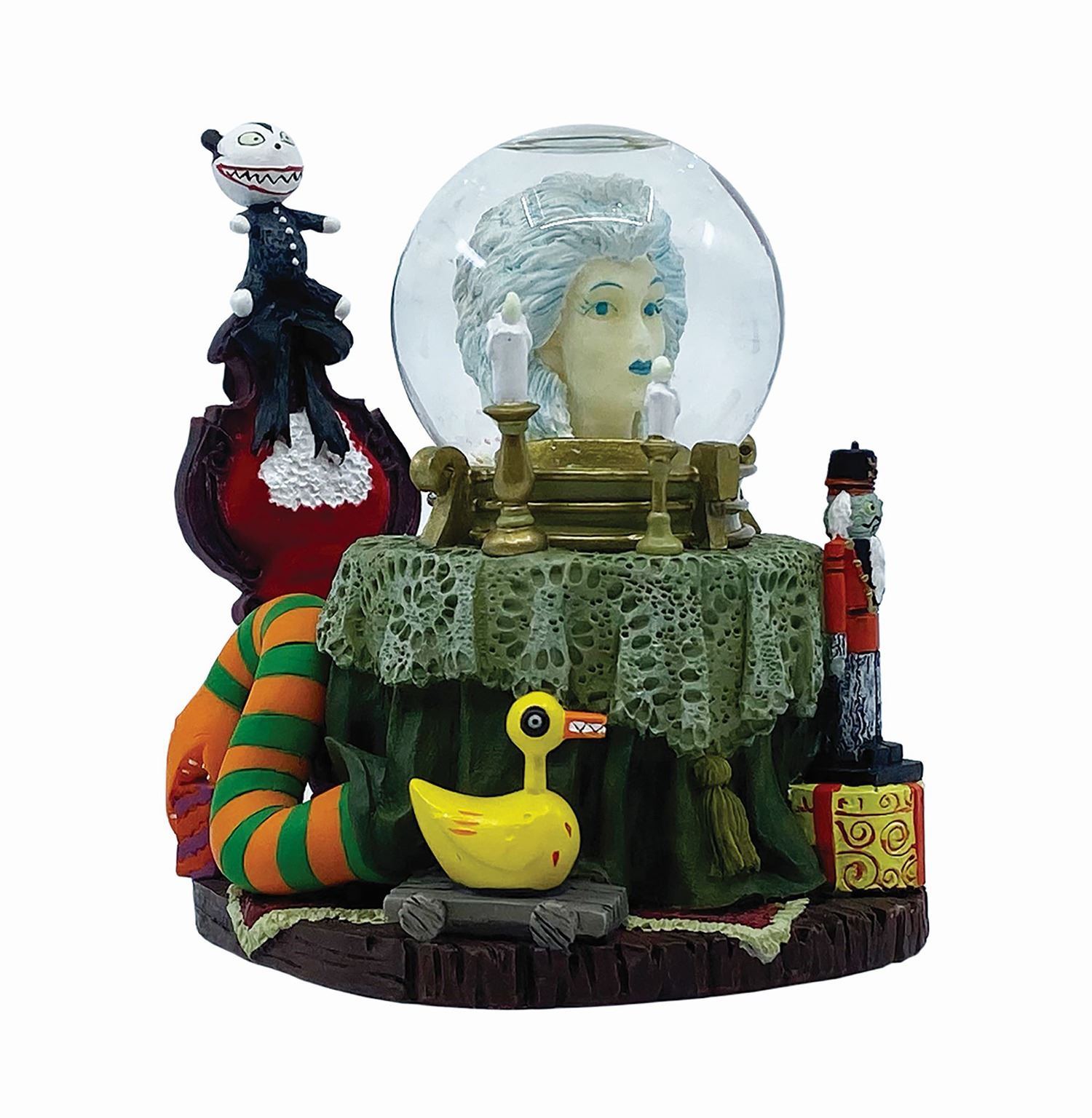 (Disneyland, 2003) A rare snowglobe inspired by the Haunted Mansion Holiday event at Disneyland. The detailed snowglobe depicts Madame Leota from the Haunted Mansion, as well as the killer duck pull toy, vampire teddy, and giant snake from Nightmare Before Christmas. Measuring 3"x4" and 4" tall, the resin snowglobe is in very fine condition.