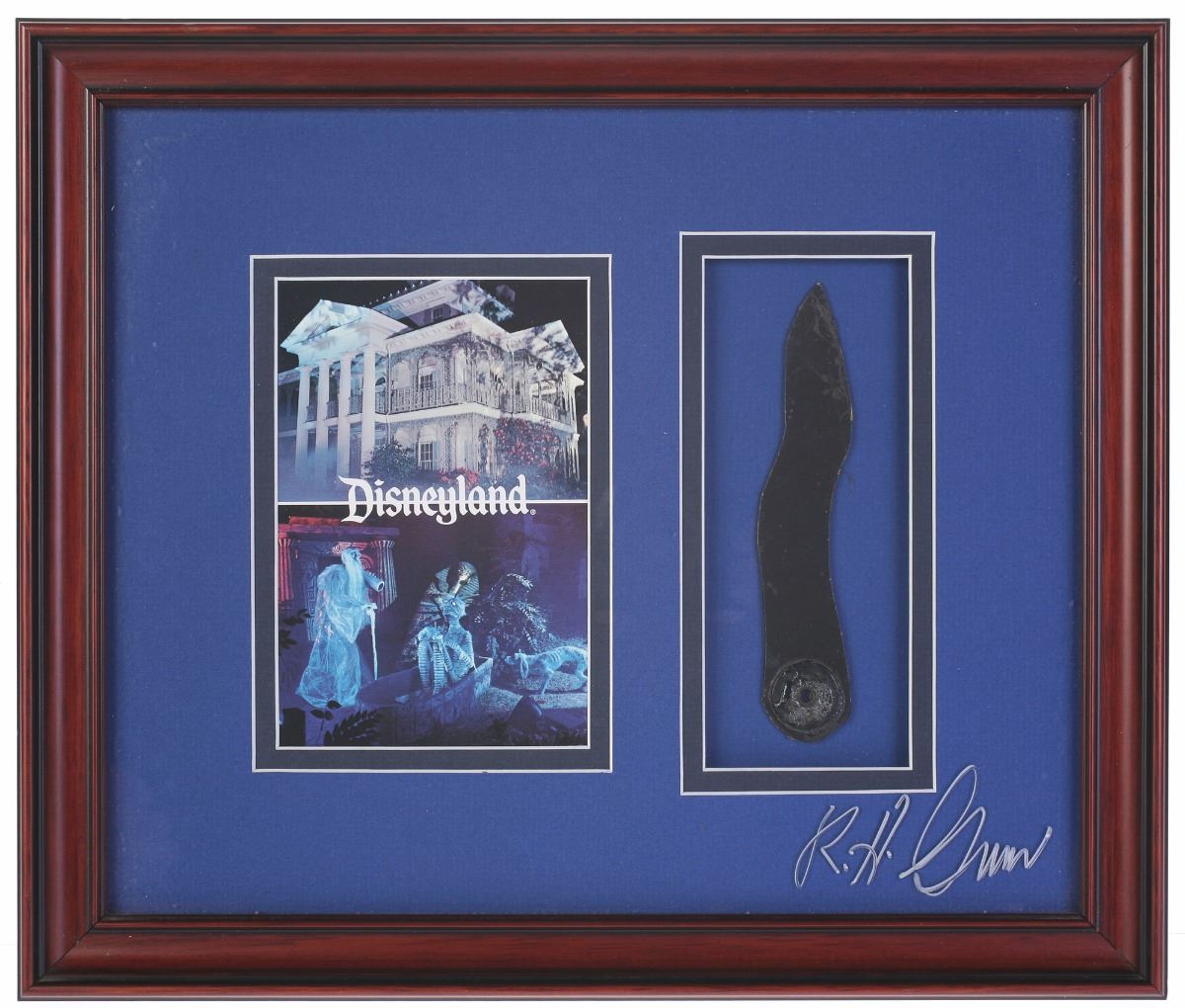 (Disneyland, 1980s) Extremely rare prop hand from the backwards running clock within the "Haunted Mansion" attraction at Disneyland. This piece has been framed next to a "Haunted Mansion" postcard and has been signed on the glass by legendary Imagineer Bob Gurr. The clock hand measures 5.5" long within the 12"x14" frame. In very good condition with expected wear to the hand from use at the park.