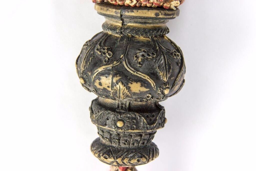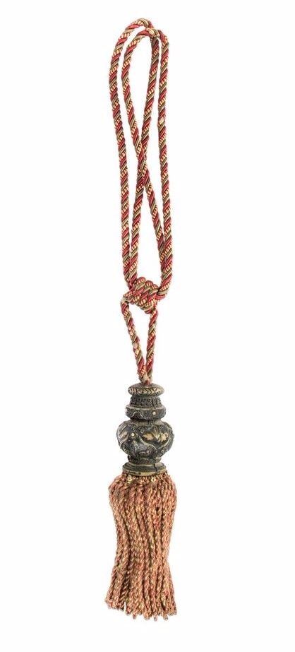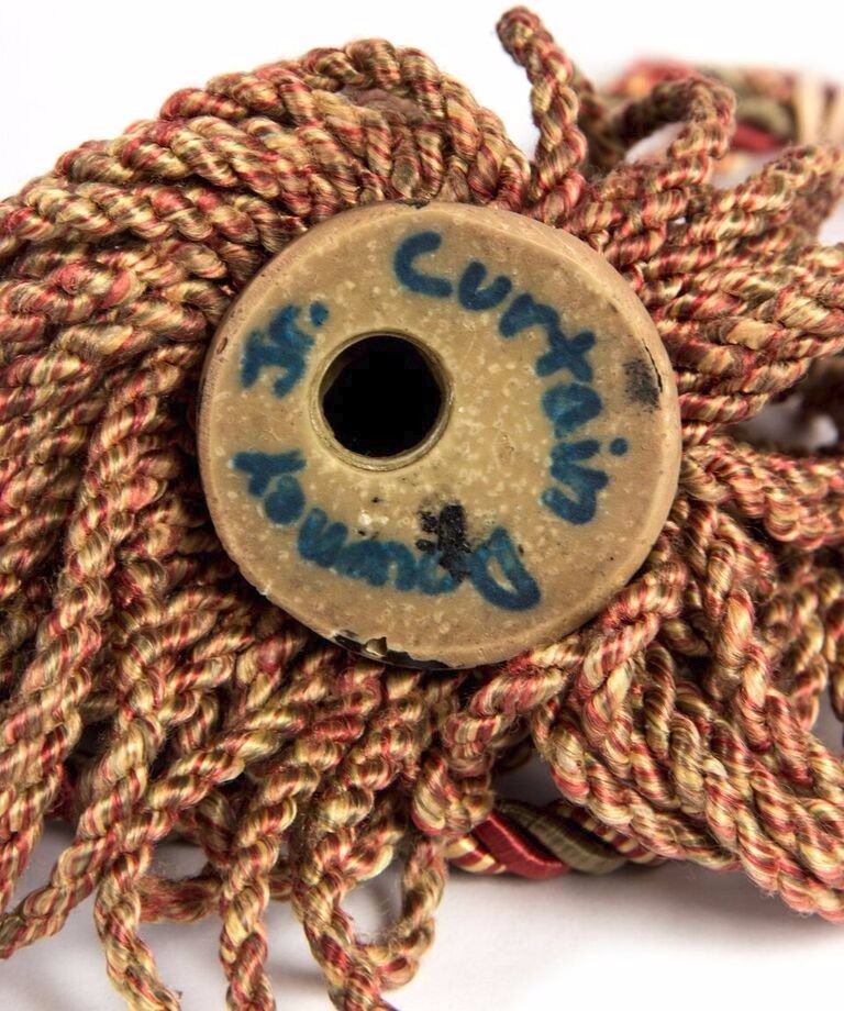 (Walt Disney World, c.1970s) A very rare curtain tassel prop from the "Haunted Mansion" at Walt Disney World. This tassel is composed of painted resin and rope, and features a hand-written note "Curtain - Downey Jr." along the base of the resin, hidden under the rope strands. This item measures 26" long and is in good condition with some scuffing and minor wear.