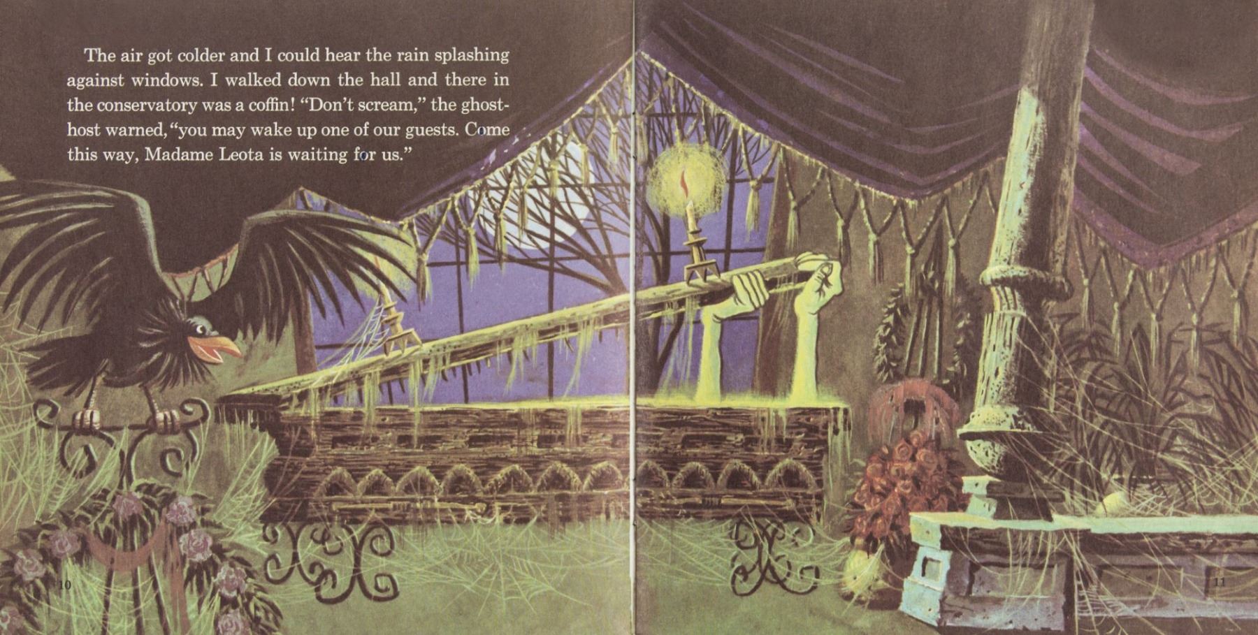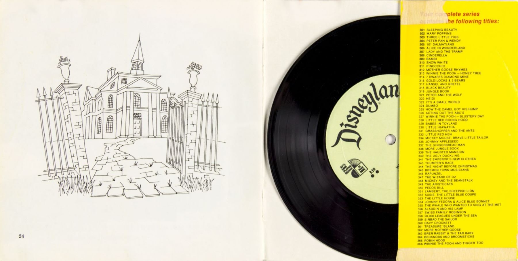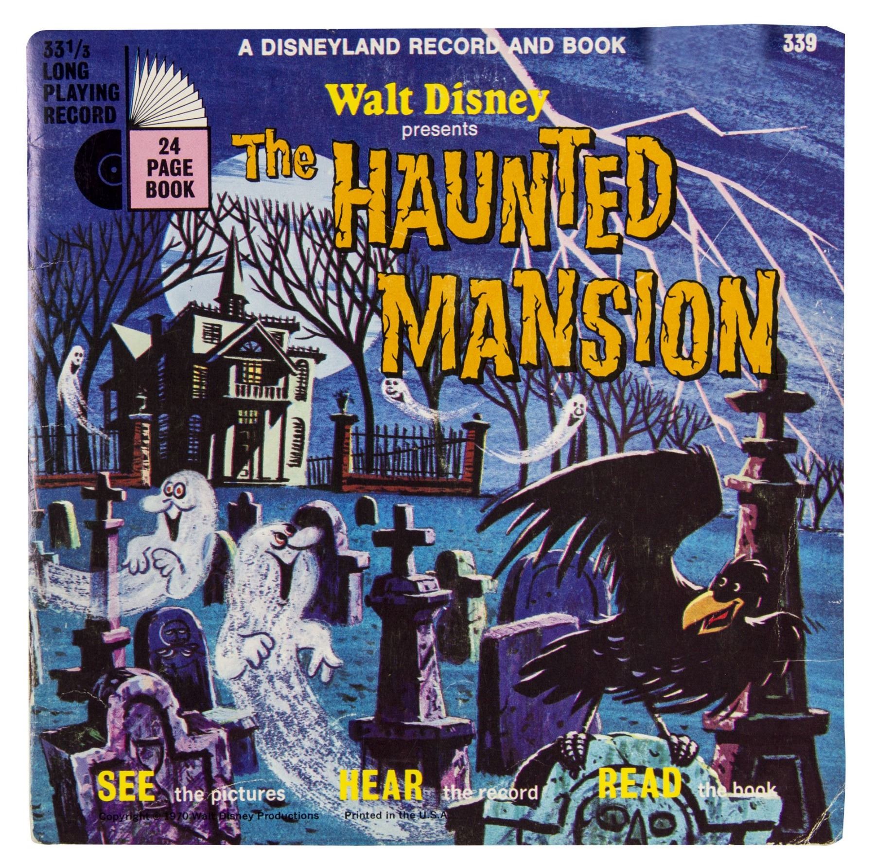 (Disneyland, 1970) A Disneyland record and book that features a story and music from the "Haunted Mansion" attraction. This 7.25"x7.25" record includes an illustrated 24-page story and is in very good condition with some wear throughout, including two pieces of tape on the back cover.