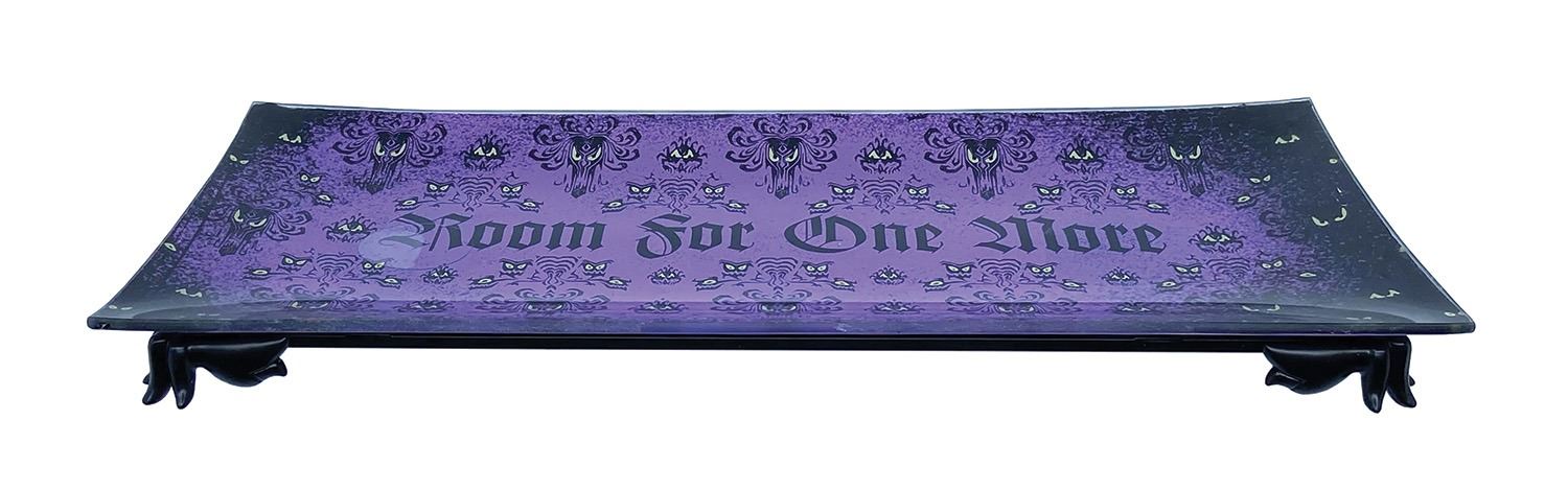 (Disneyland, c.2000s) A glass tray inspired by the Haunted Mansion wallpaper from Disneyland. The rectangular glass dish features curved edges with the phrase "Room for One More". Measuring 13.75"x5.75" and 1" tall, the dish is in good condition with minor wear and chips in the edges, small scratches in the printed image in multiple areas, and a circular flaw in the printing where the base is adhered to the glass at the letter "R". These imperfections appear to be manufacturing defects that were common for this item.