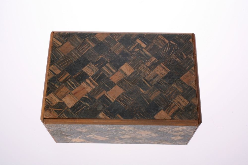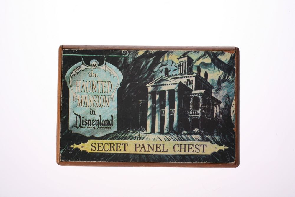 (Disneyland, 1970s) The very rare large-sized Disneyland version of the very popular "Haunted Mansion Secret Panel Chest" puzzle box. A hidden latch on the side opens and pulls down, allowing the top of the box to slide out. The removal of the top of the box reveals a hidden compartment and allows for the other side panel to lift, revealing an additional hidden drawer. Once the drawer is pulled out, it appears as though it is just a shelf, until the top half is removed, showing the thin interior compartment. A very charming and intricately built item. Measures 6"x4" and 3.25" tall. In good condition with some wear throughout and the panels can be a little tough to maneuver on occasion.