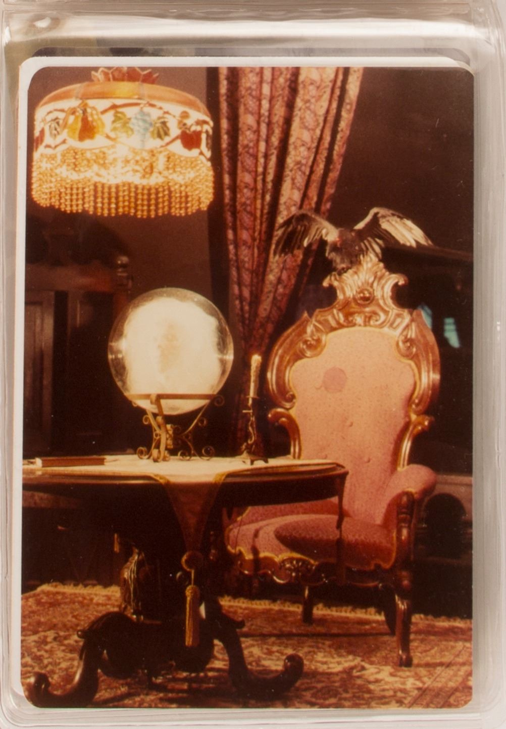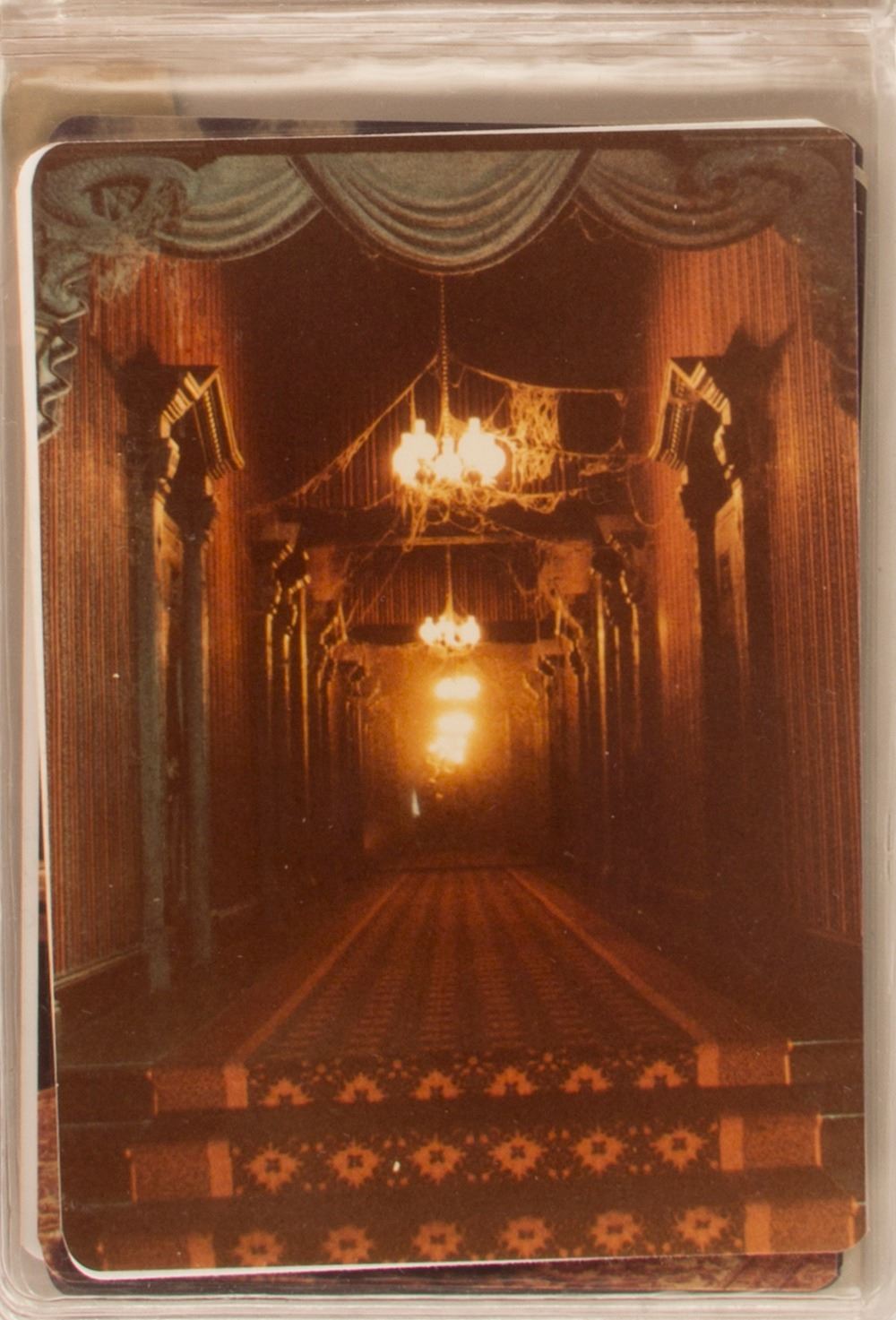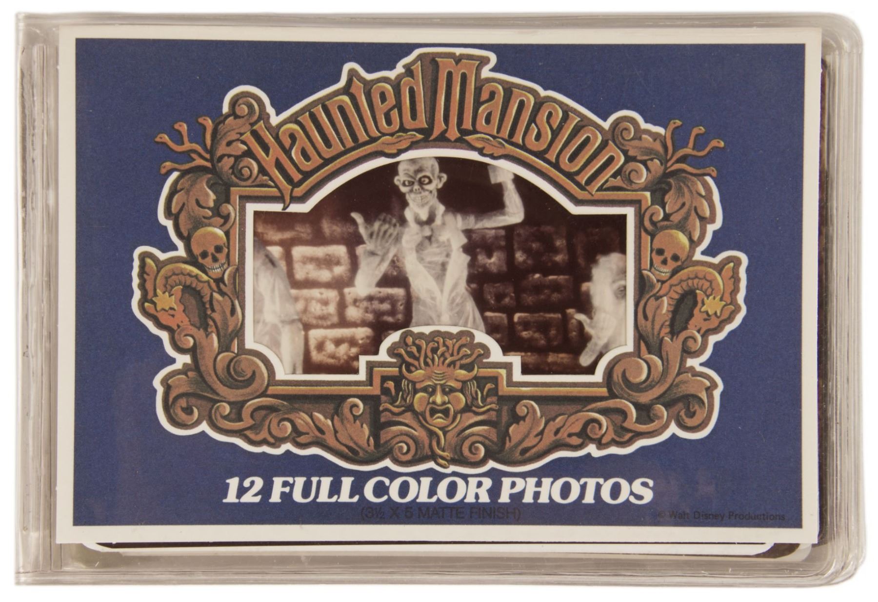 (Disneyland, c.1970s) A very rare souvenir booklet containing (12) full-color photos from the Haunted Mansion. These photos provide a fantastic look at aspects of the attraction that are seldom seen in this detail or lighted in this way. Each photo measures 3.5"x5" and is contained within a clear plastic photo sleeve with a die-cut Haunted Mansion cover image. The condition is very good and the reverse still retains its original Disneyland sales sticker.