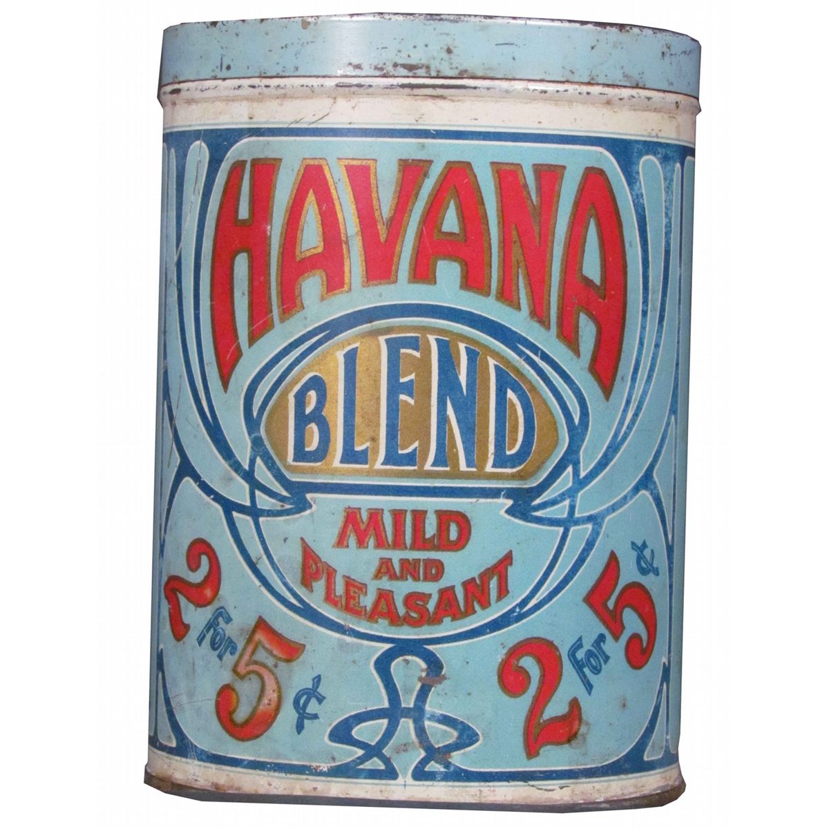 Havana Blend Cigar Tin for 50 Cigars. National Can Co. Detroit. Some discoloration and scratches otherwise good condition. 4 1/2 inch diameter X 6 inches tall.