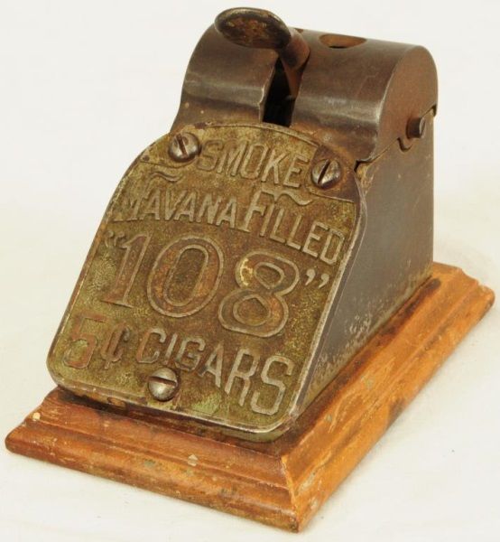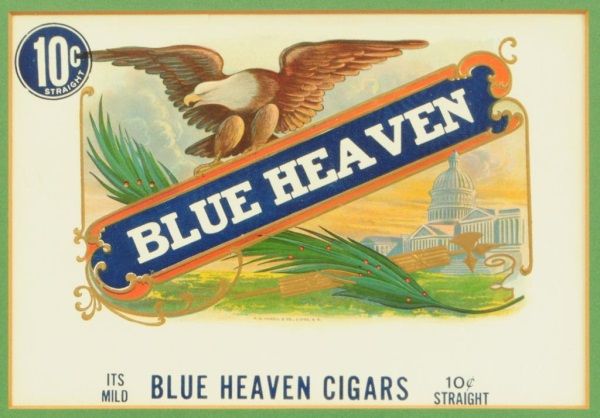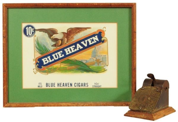 Framed Blue Heaven 10 cent cigars advertising lithograph (image measures 8 3/4" x 6") and Havana Filled "108" 5 cent cigars cutter (3" wide x 4 1/2" deep x 4 1/2" tall).