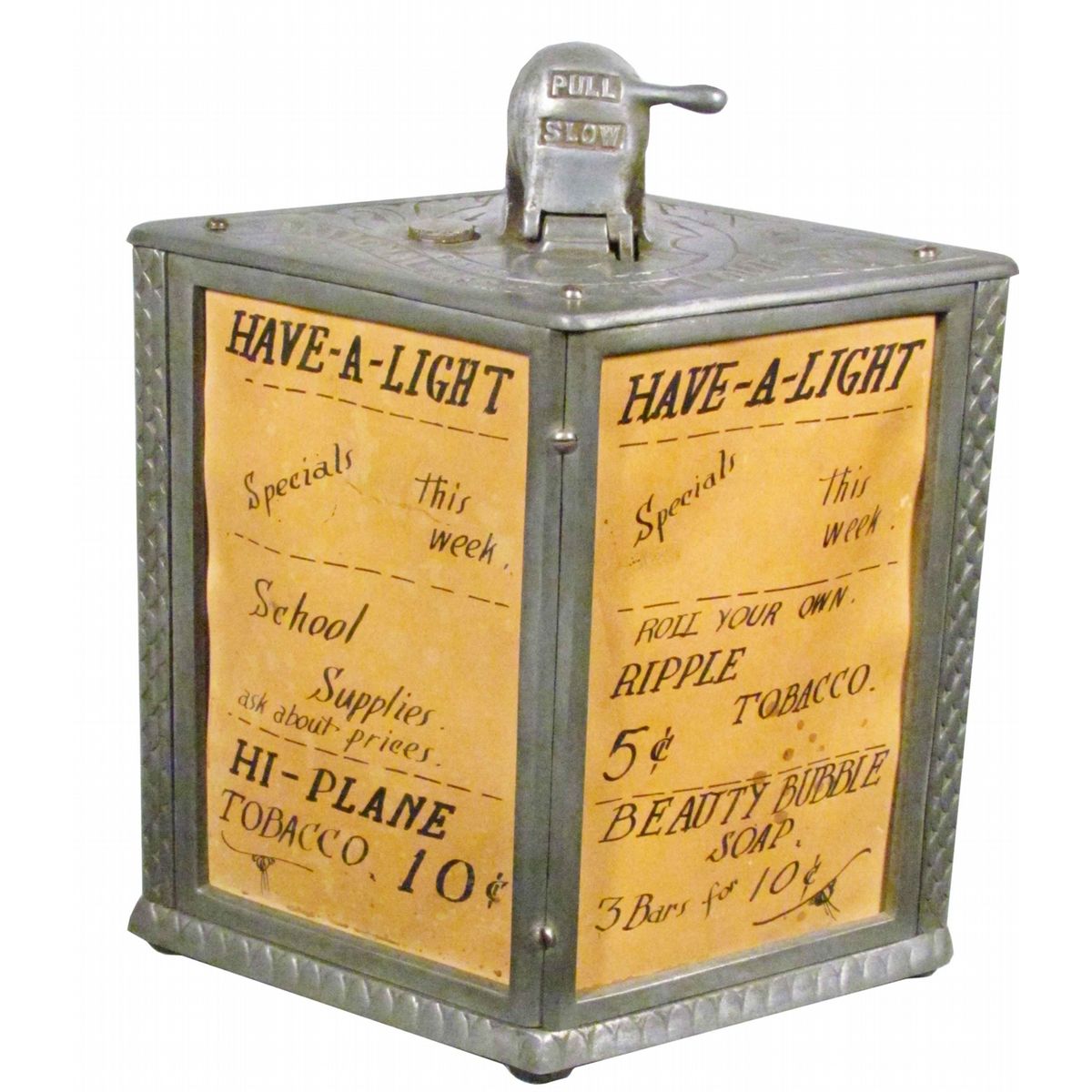 Have-A-Light Jump Spark Advertising Cigar Lighter. National Mfg. Co, St. Louis. Cast iron, with paper advertising. Excellent original condition. 7 1/2 X 12 1/2 X 11 1/2 inches.