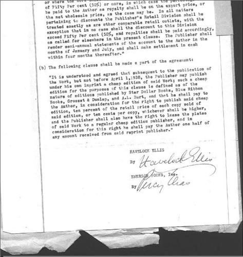 Havelock Ellis. English scientist who gave up medical practice to devote himself to research. His seven volumes based on his study of the psychology of sex appeared from 1897 to 1928. Author of Love and Marriage, Psychology of Sex, etc. His own marriage was unique: he resided in the city, his wife on a farm. Archive of about 181 pieces: 1 A.L.S.; 1 note in Ellis' hand at top of a document; Ellis' signature on three legal documents; copyright with seal for one of his books; six royalty receipts; copy of review of Psychology of Sex recommending it become a textbook for medical students. Also various letters, copies of letters (some from Ellis), documents, photos of Ellis, ads for his books, three-page letter on his last illness from caretaker, numerous papers on copyrights, taxes, royalties, contracts, and legal matters, from 1933 to 1977. Some defects, but generally good-fine. With Ellis' classic study, in three editions, of his book Psychology of Sex, each with dust jacket, cloth, 377 pp., comprising: 1) Signed copy. Emerson Books, N.Y., 1938. Toning at front and back hinges, else fine. Signature on verso of title page. 2) 1933, First Edition, Long & Smith, N.Y. 3) 1937, 7th printing. Toning of front and back pages, shelf wear, spine sunned, dustjacket torn. Some dustjacket wear, else about fine.