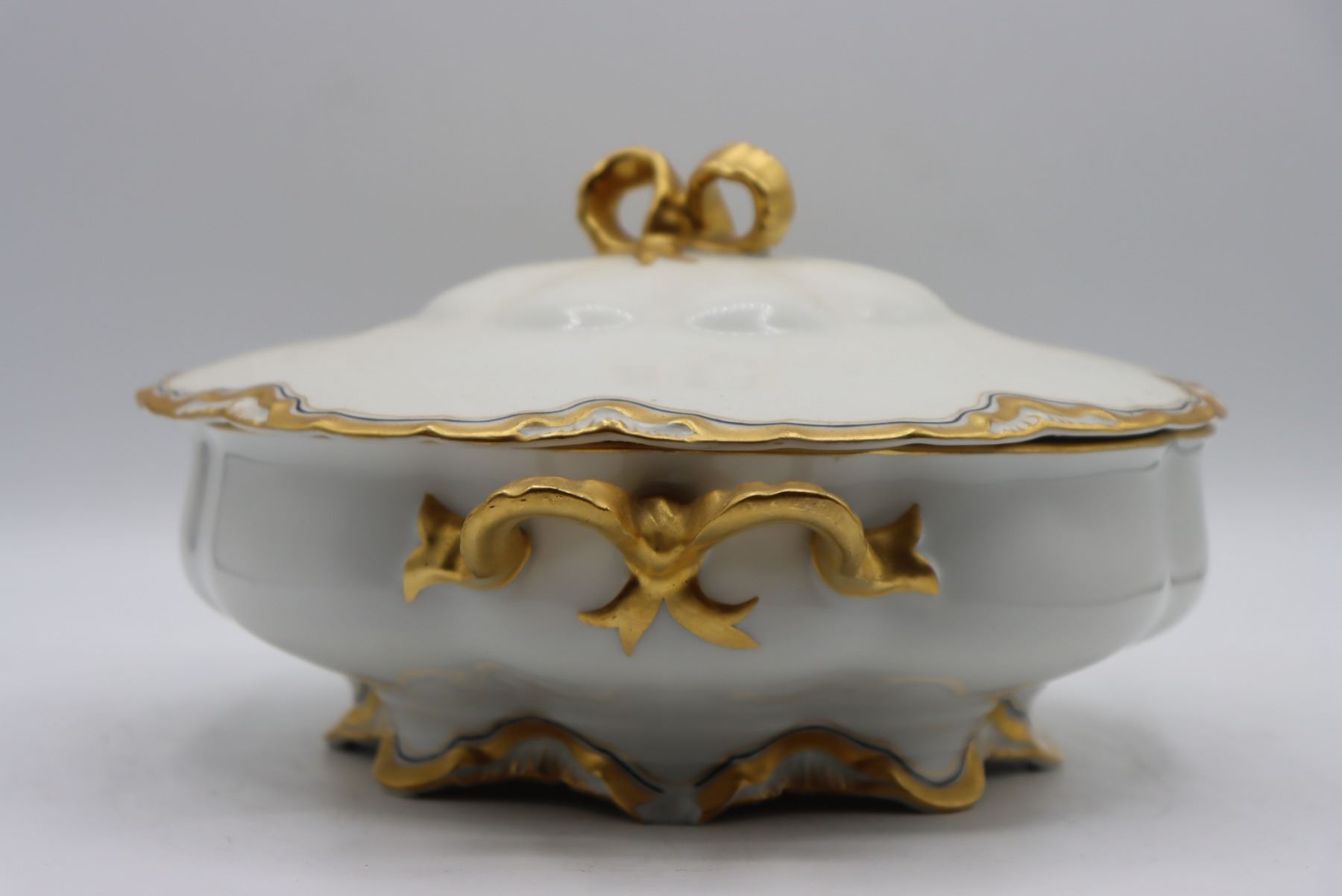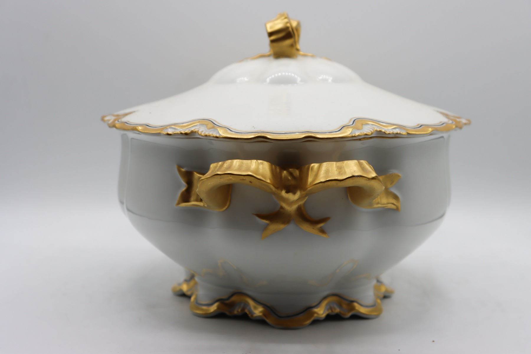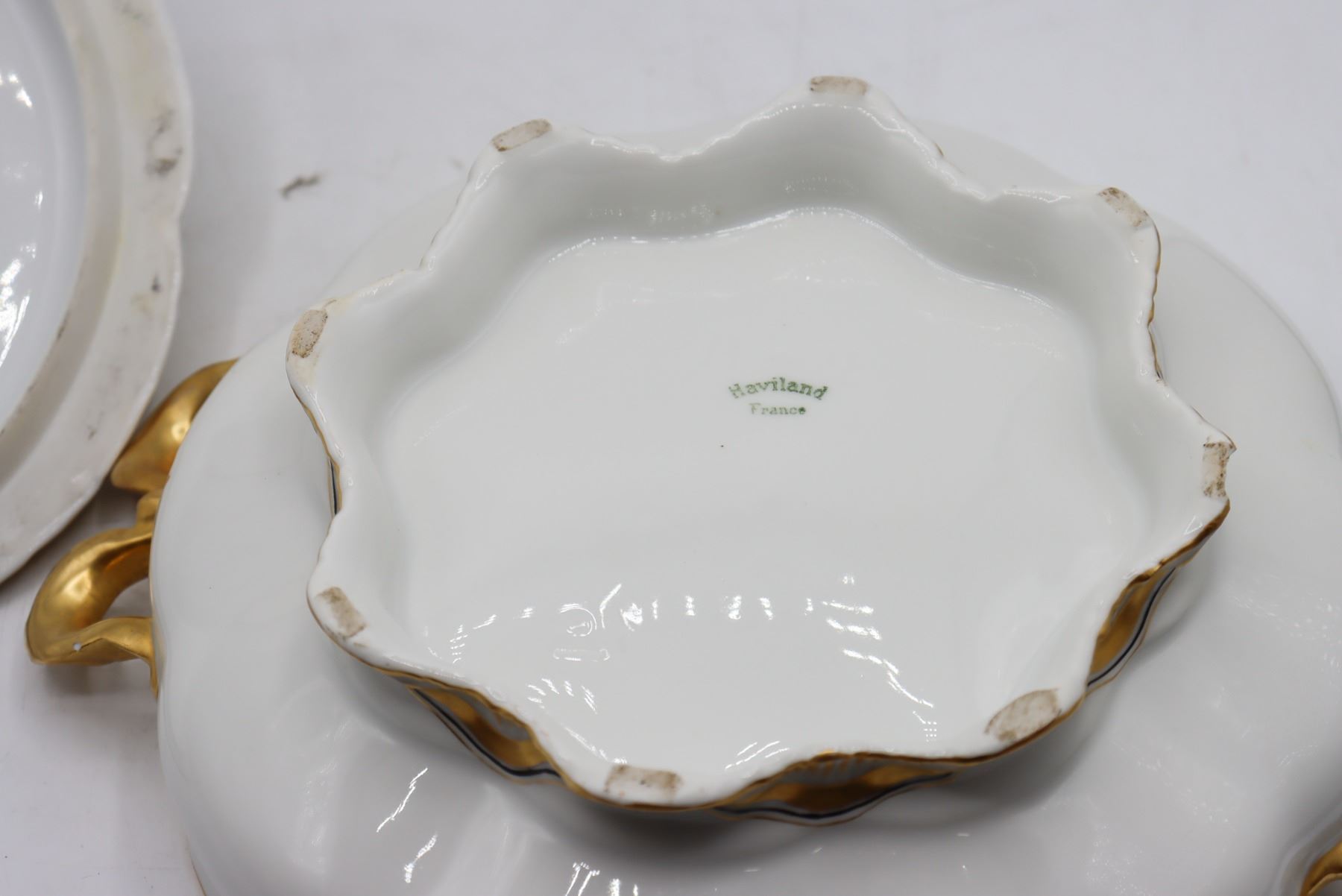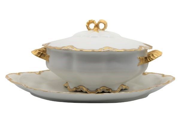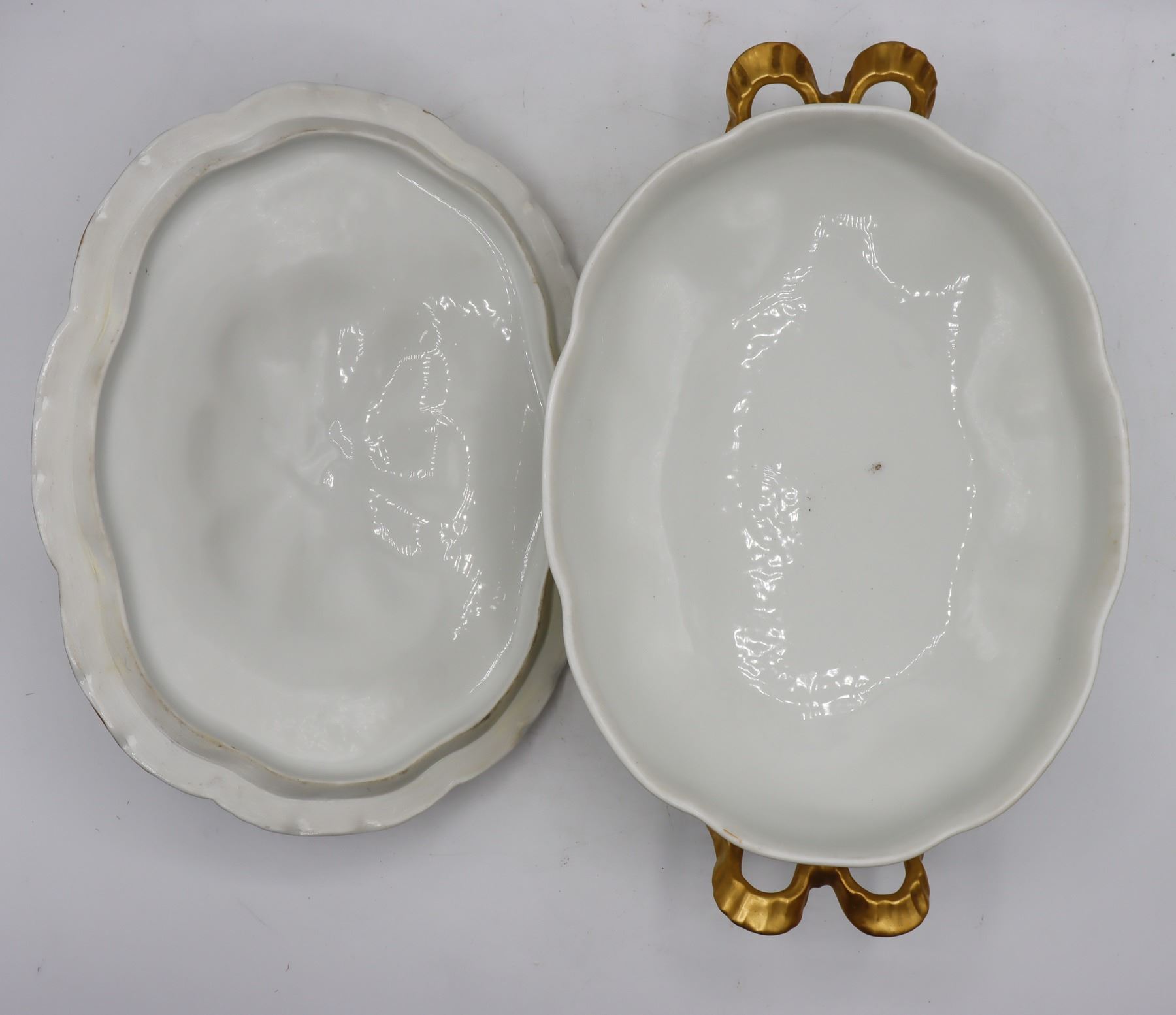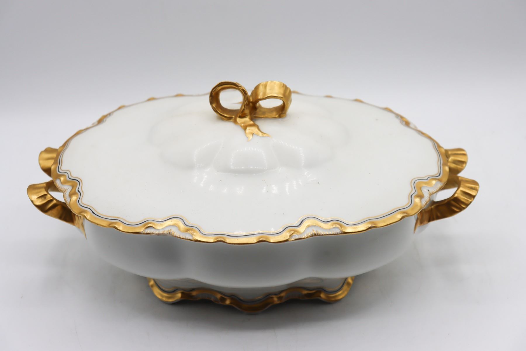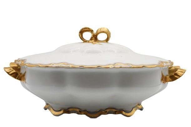 Haviland France, marked on the underside. Porcelain tureen with gilt handles. Commensurate with age.