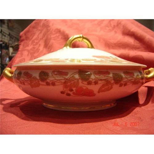 c. 1894 - 1931 Gold handles on the lid and both sides of the bowl. Has a orange/red flower with leave pattern on the lid and around the edge of the bowl. I have not been able to find the pattern name. It has the Haviland & Co. Marking as well as the Haviland Limoge marking on the bottom of the bowl.