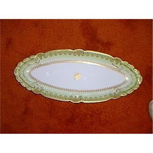 Elegant fish platter by Haviland & Company, Limoges, France measures 23.5" long by 9.75" wide. Shades of green topped with lots of gold design. Dates from 1889-1893 and in marvelous condition: no chips, cracks or worn gold. Can be used for fish or would make a great buffet tray with cold cuts, cheese or hor d'hourves. Just let your imagination run wild and imagine this beautiful platter on your dining table.