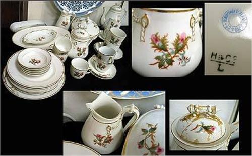 Haviland Limoges Thistle pattern china 1 platter 1 sugar, 5 berry bowls, 5 plates. Lid to teapot is repaired, creamer is broken