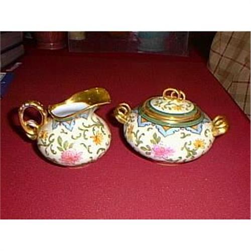 Creamer & sugar set by Charles Field Haviland, Limoges, France--handpainted by Pickard in a very oriental design. Pink flowers with gold design. Handles are like gold ribbons. Excellent condition-no chips, cracks, worn gold or worn paint