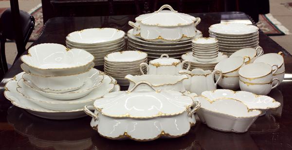 (lot of 65) Haviland Limoges table service for eight, having a scalloped and gilt border on a white ground, consisting of dinners, soups, five salads, breads, salts, berry bowls, cups with saucers, cream and sugar, gravy boat, covered tureen, four graduated serving platters, condiment bowl, and two vegetable bowls