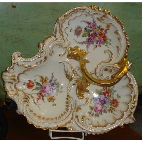 Haviland Limoges three part dish. Hand painted with lovelyflowers. 24 carat gold trim.lovely curled shaped handle excellent condition no chips, cracks or repairs gold trim in excellent condition, 13" long 12"wide Very delicate painting