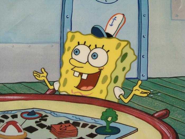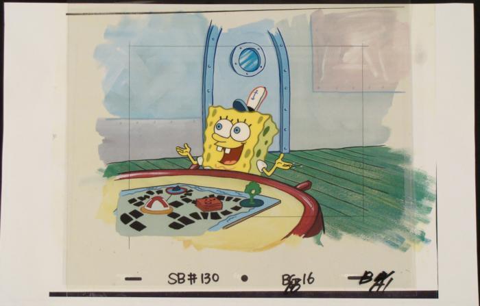 This animation cel and reproduction background are from the Nickelodeon TV show SpongeBob Squarepants. The story takes place under the deep blue sea in Bikini Bottom, where SpongeBob resides. SpongeBob, who is a yellow, porous sponge, is your typical happy-go-lucky character, as he is always cheerful and enjoys making people laugh. Patrick Star, SpongeBob's neighbor who is a starfish, is your average children's show idiot, as he boasts knowing nothing and is often getting himself into ridiculous situations. Between the homes of these two lies the home of the miserable Squidward, a squid, who is known for being grouchy and playing tricks on SpongeBob and Patrick. Both SpongeBob and Squidward work at the Krusty Krab, a fast food business run by the greedy money-loving Mr. Krabs, a crab, the arch rival of the evil, possibly misunderstood, Plankton. Another neighbor, Sandy Cheeks, an athletic squirrel who normally wears an astronaut's space suit, was introduced in "Tea at the Treedome." She spends most of her time inventing and experimenting. SpongeBob seems to love board games.Original Printed Background and Animated Cel Overall Size of Background: 11" x 17" Overall Size of the Cel: 10 1/2" x 12 1/2" Very good condition; it has been storedThis is an original hand-painted cel set-up used in the production of an episode of "SpongeBob SquarePants." Each one-of-a-kind set-up represents a slight change in position of the characters. When individually photographed and projected in rapid succession, the images appear to move.