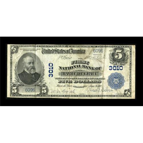 <B>Havre de Grace, MD</B></I> - $5 1902 Plain Back Fr. 598 <B>The First NB</B></I> Ch. # 3010<BR> An extremely scarce bank with just six large (and even fewer small) notes making up the entire census. This newly discovered piece is as nice or nicer than any, and is the first large note of any kind to be offered from here since 2001. <B>Fine-Very Fine,</B></I> with clear signatures. <BR><BR><b>Shipping:</b> Coins & Currency (<a target="_blank" href="http://www.heritageauctions.com/common/shipping.php">view shipping information</a>)