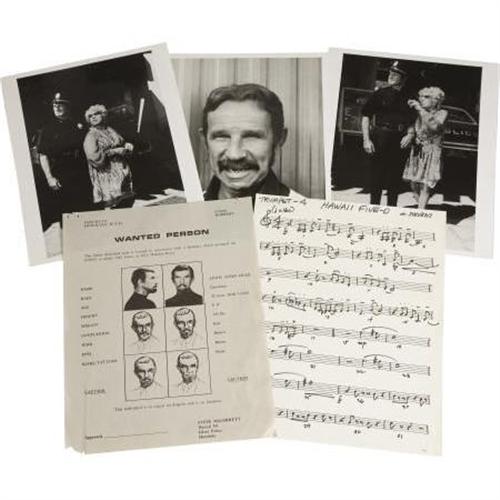 <B>"Hawaii Five-O" Handwritten Score and Props from the Series.</B></I> The <I>Hawaii Five-O</B></I> theme song is perhaps the most recognizable in TV history, and this is an original hand-written orchestration chart for the main title trumpet given to actor Jack Lord by theme song creator and conductor Morton Stevens at the conclusion of the series. The cresting wave and the pumping horns of the show's opening are as iconic as the coolly confident McGarrett himself, and Stevens won an Emmy Award for Outstanding Achievement in Music Composition when the show premiered in 1969, and the rest is history. Also in this lot, this Wanted Persons flier from Hawaii 5-O, Honolulu Police Department, that describes Lewis Avery Filer in photographs and artist sketches with the warning, "This individual is an expert on disguise and is an inventor. Steve McGarrett, Hawaii 5-O, Iolani Palace, Honolulu." Also, three black & white 8" x 10" surveillance photos of Lewis Avery Filer, one in disguise as a man, two in drag as a woman and made for the 1971 <I>Hawaii Five-O</B></I> episode, "Odd Man In" starring actor Jack Lord as Steve McGarrett. All items acquired from the Jack Lord estate. <I>Authenticated by the world's foremost curators of television artifacts, The Comisar Collection of Beverly Hills.</B></I><BR><BR><b>Shipping:</b> Clothing, Costumes & Jerseys (<a target="_blank" href="http://www.heritageauctions.com/common/shipping.php">view shipping information</a>)