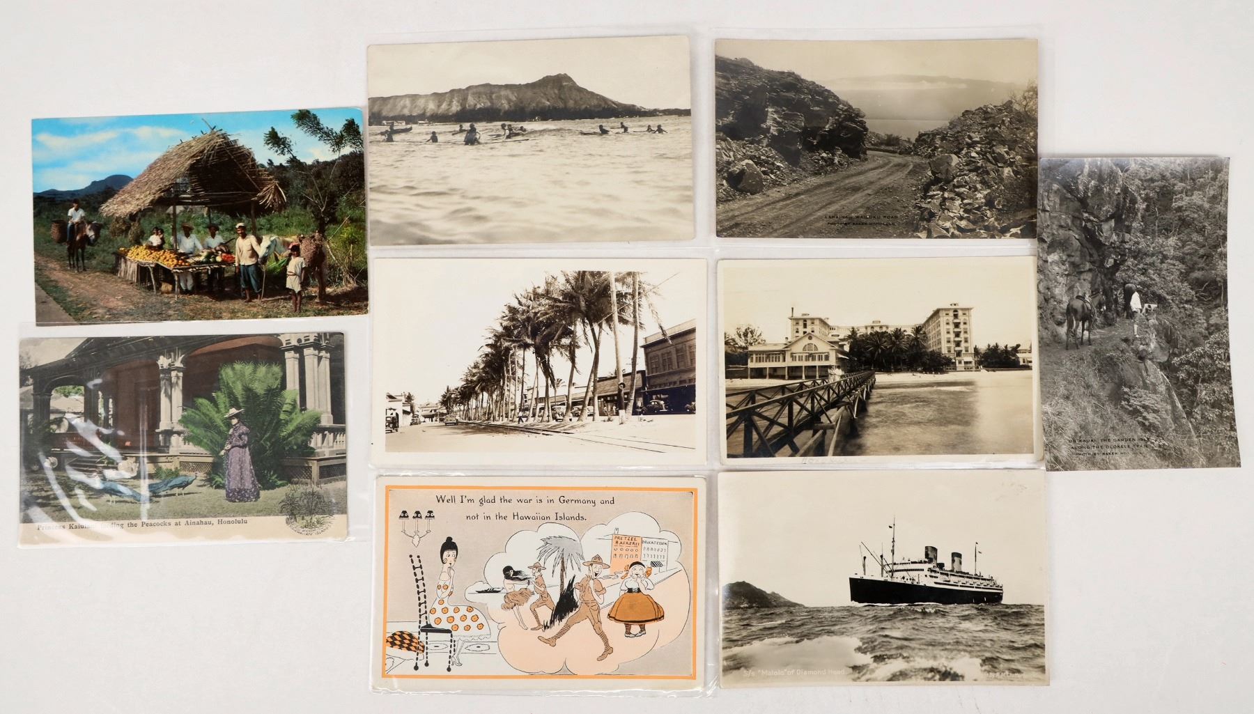 Lot of 9 including six different real photo postcards (surfing, SS Malolo, Lahaina-Wailuku Road, Kaui, and Kahului street scene). Also early Aloha Nui card of Princess Kaiulani feeding peacocks, and rare humorous WWI-related card.
